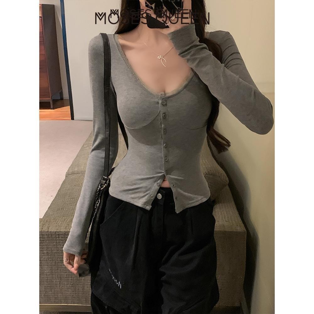 Moses QUEEN อเมริกันสาวร้อนคอวีขอบลูกไม้แขนยาวถักเสื้อสเวตเตอร์ถักหญิงฤดูใบไม้ร่วงสลิมสั้นด้านในสวมใส่อารมณ์สีดํา Bottoming เสื้อ #62831
