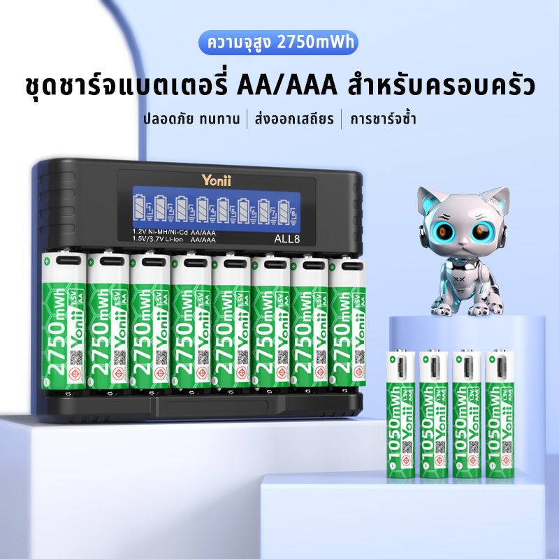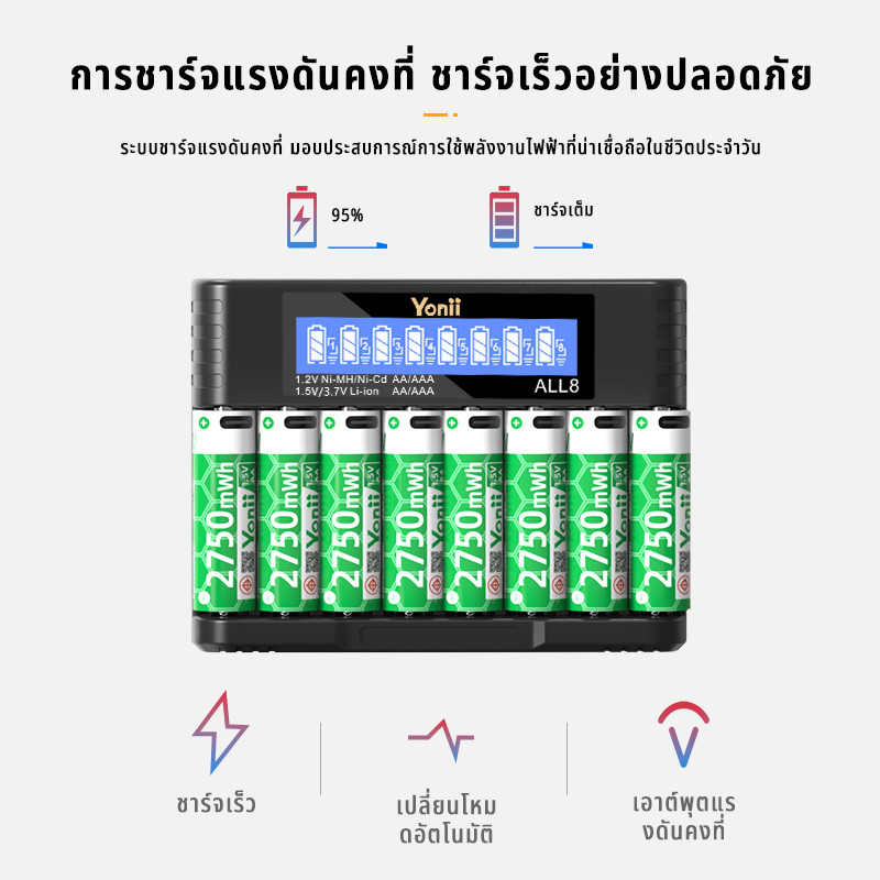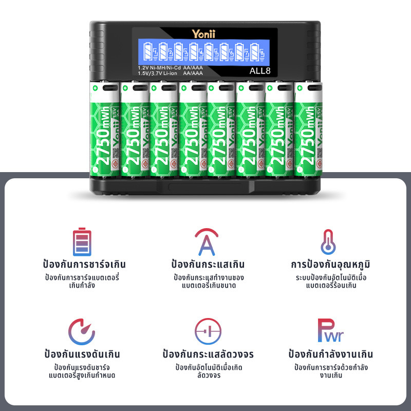 Yonii ALL8 แปดสล็อต LCD Smart Charger, 1.5V Li-ion แบตเตอรี่ AA2750mWh/AAA1050mWh,1.2V Ni-MH แบตเตอรี่ 2A/3A Charger