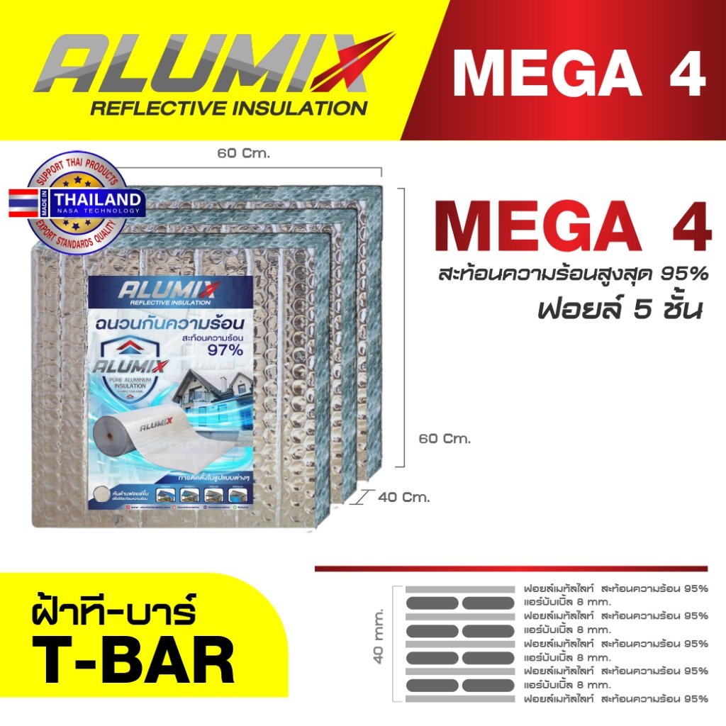 ใหม่! 1 แผ่น MEGA4 Ceiling ฉนวนบนฝ้า 60cm x 60cm หนาพิเศษ 40 mm ฉนวนกันความร้อน สะท้อนความร้อน 97%