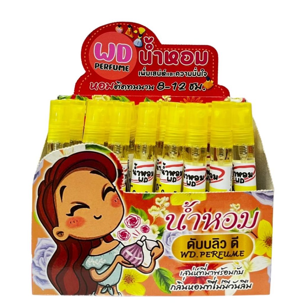 น้ำหอม 10 มล. ฝาสเปร์ยสี บรรจุ 24 ขวดต่อกล่อง น้ำหอมติดทนนาน 12 ชม.มีให้เลือกหลายกลิ่น โดยดับบลิวดี พาร์ฟูมส์