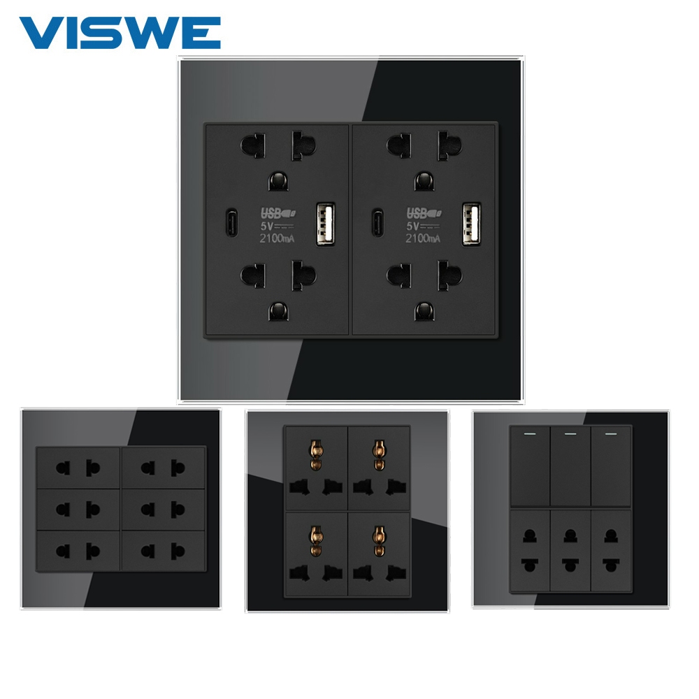 VISWE ซ็อกเก็ตสากลผนังและสวิตช์ไฟ ขนาด 120*120 มม. สีดำ กระจกนิรภัย ซีรีย์ K6C