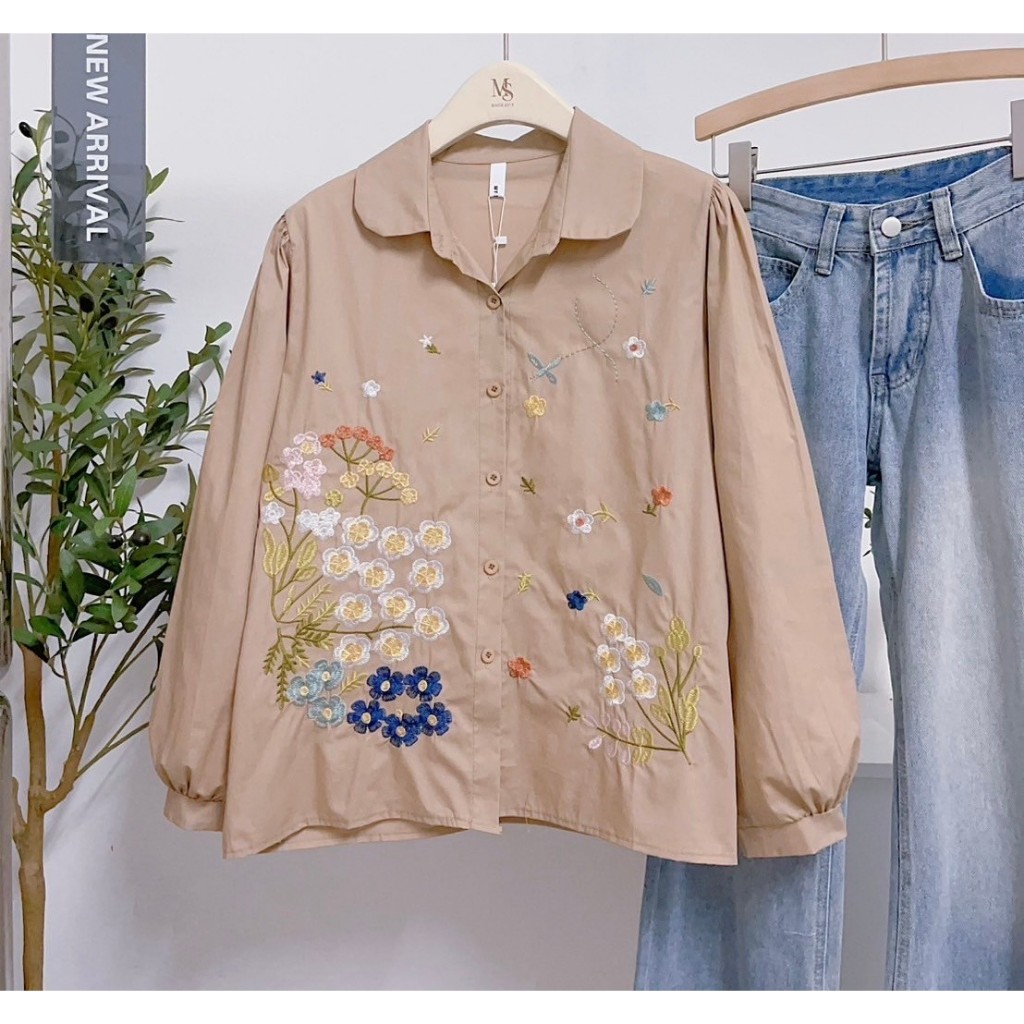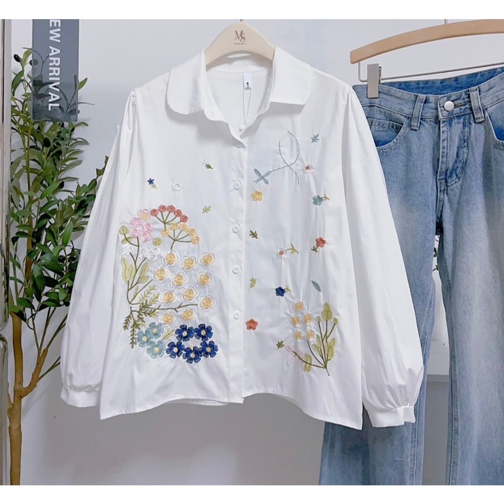 ป้าย My SHOP เสื้อผ้าคอตตอนแขนยาวปกบัวปักดอกไม้ด้านหน้า อก 42 นิ้ว ยาว 24 นิ้ว