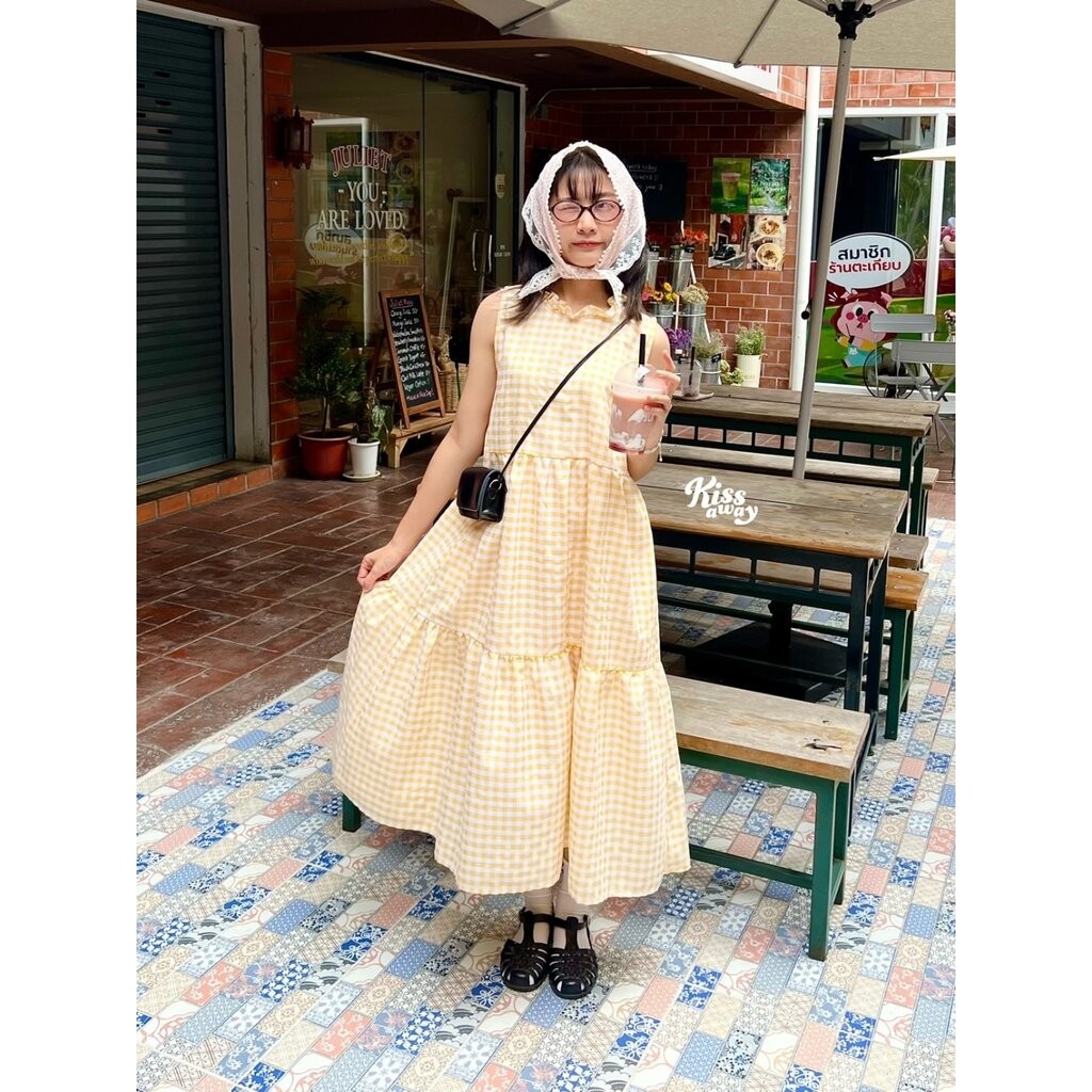 Teddy (065) เดรสน่ารัก มีกระเป๋า ลายตารางฟ้าขาว คอระบาย ชุดไปค่าแฟ ชุดไปทะเล by kissaway