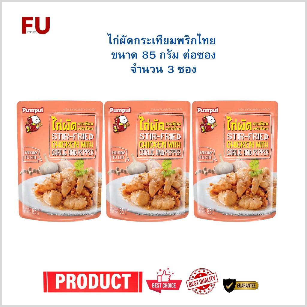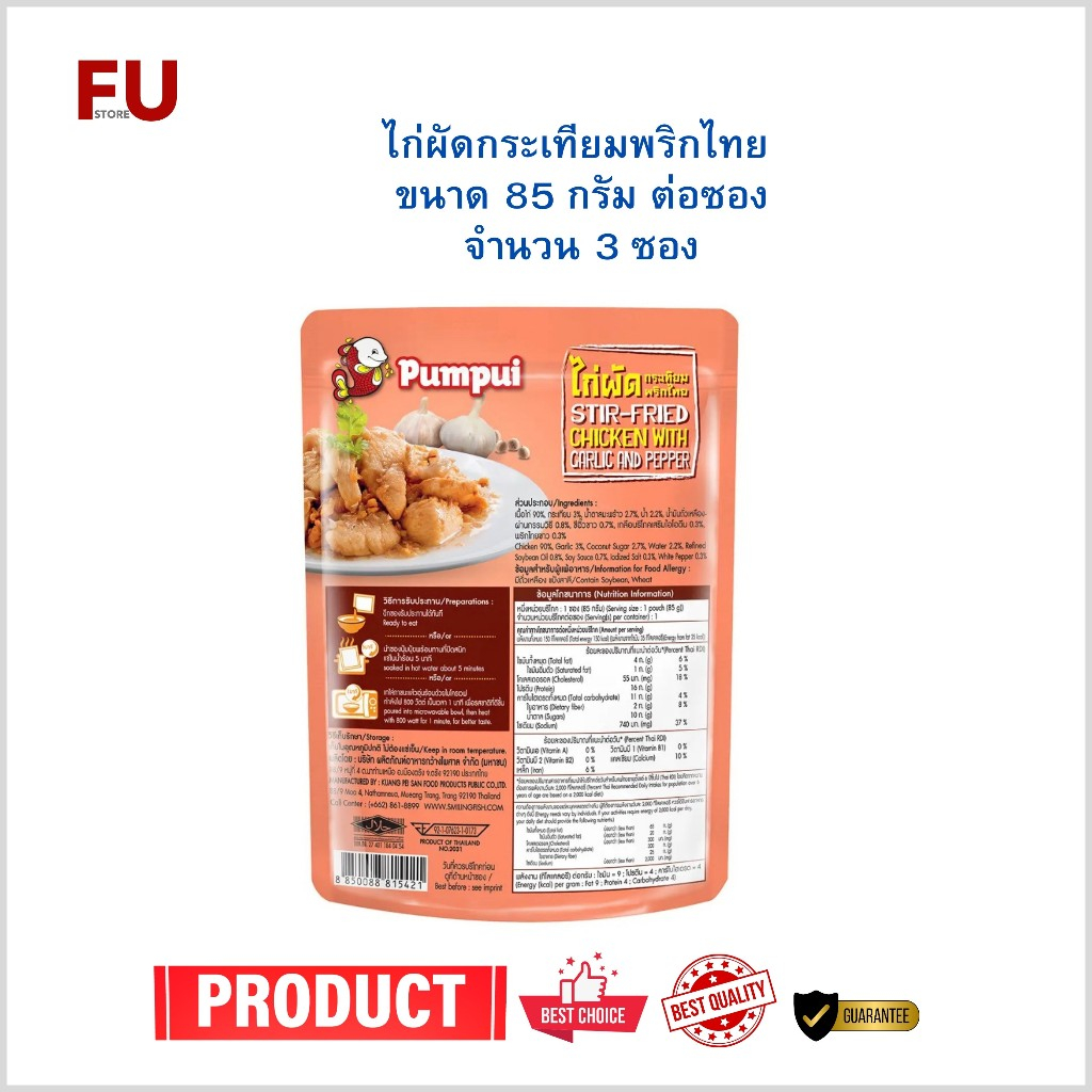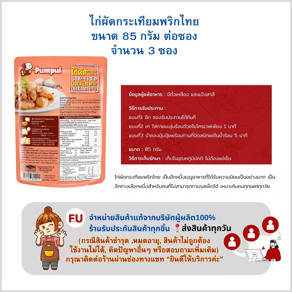 FUstore(3x85g) ปุ้มปุ้ย ไก่ผัดกระเทียมพริกไทย pumpui stir fried chicken with garlic and pepper /อาหารซอง พร้อมทาน ฮาลาล