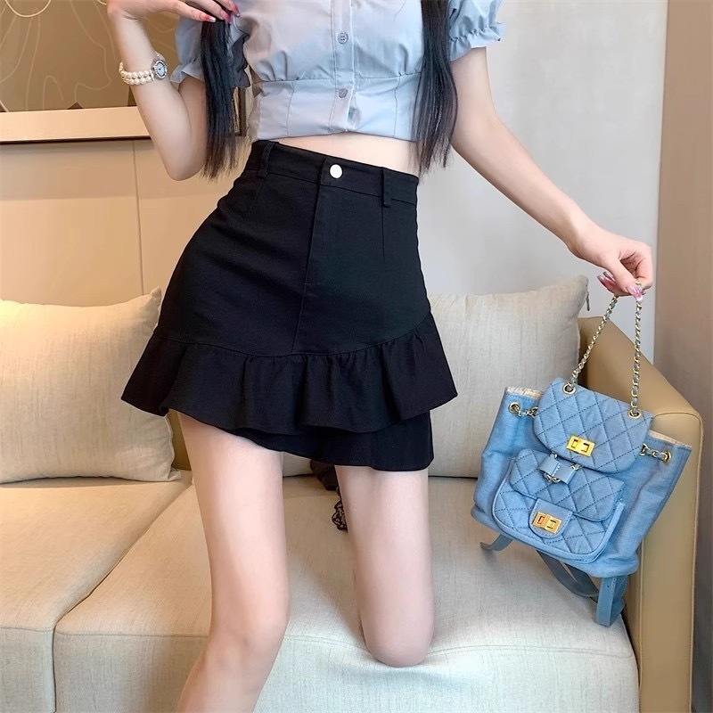PX กระโปรงยีนส์ผู้หญิง กระโปรงยีนส์ขาสั้น สไตล์เกาหลี มีซับใน แต่งชายจีบโค้งสุดเก๋