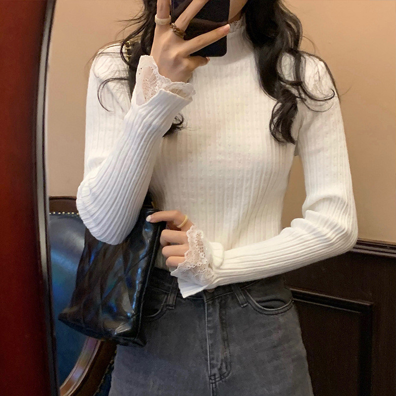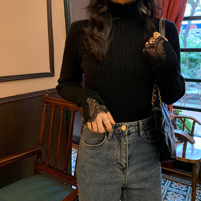 ลูกไม้เย็บเสื้อ จุดต่ําสุด ผู้หญิงสไตล์ตะวันตกครึ่งคอเต่าอารมณ์ บาง-พอดี สว