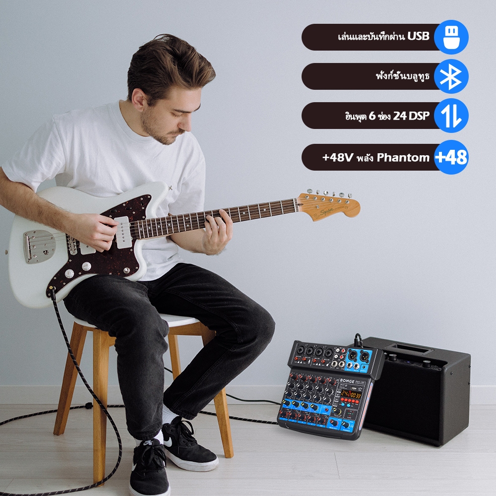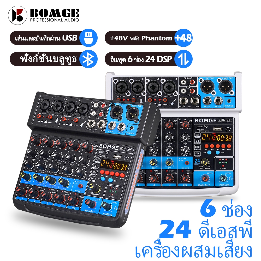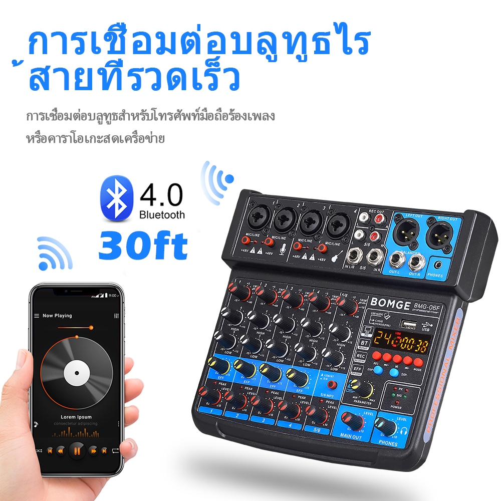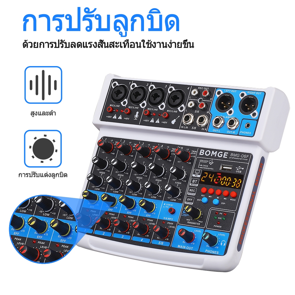 เครื่องเสียง 6ช่อง มิกเซอร์ เครื่องเสียง อินเทอร์เฟซมิกเซอร์เสียง DJ ขนาดเล็ก พร้อม MP3, USB, บลูทูธ 48V Phantom Power
