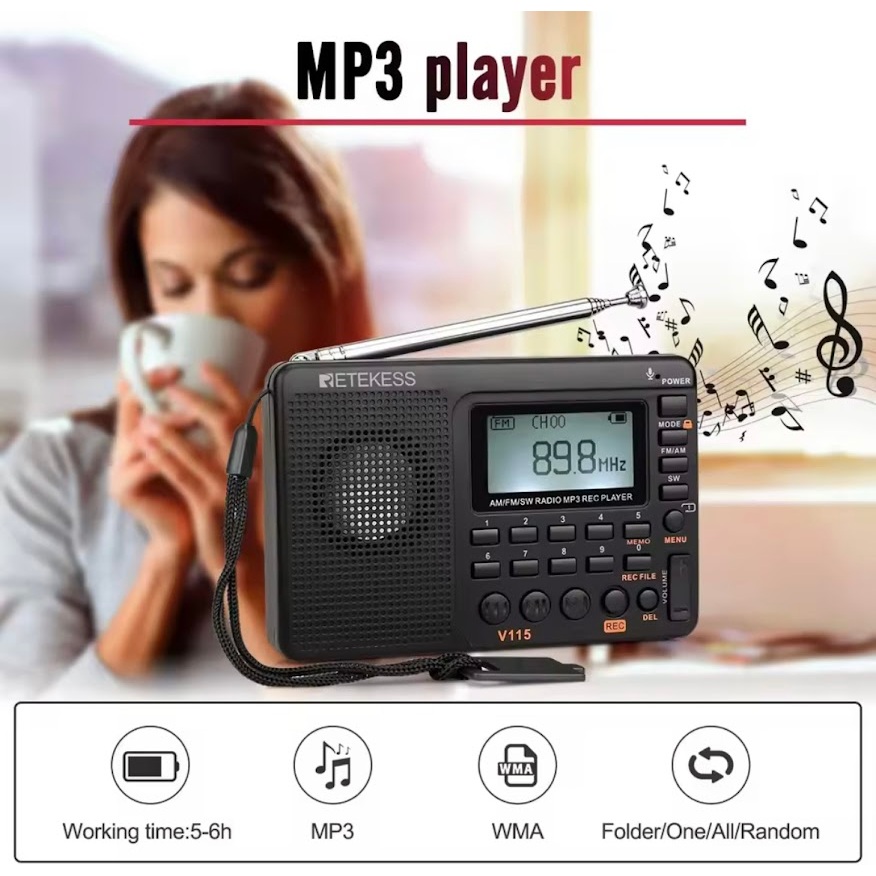 Retekess วิทยุ V115 FM AM SW วิทยุแบบพกพาชาร์จไฟได้แบตเตอรี่วิทยุคลื่นสั้นแบบเต็มลำโพง USB สำหรับผู้สูงอายุ