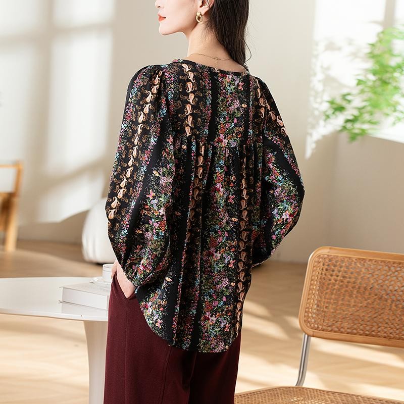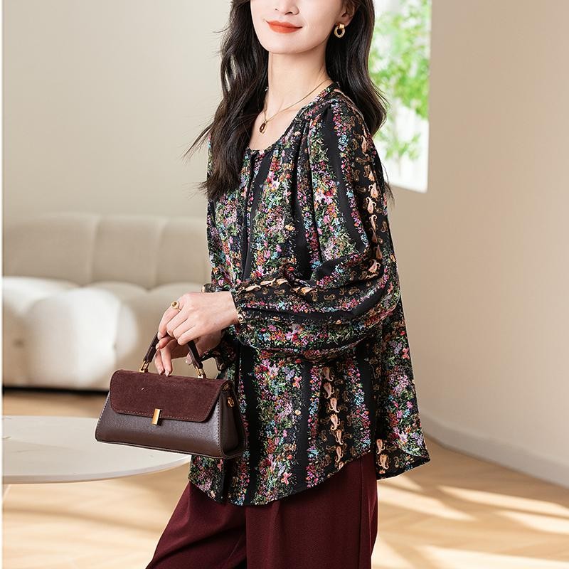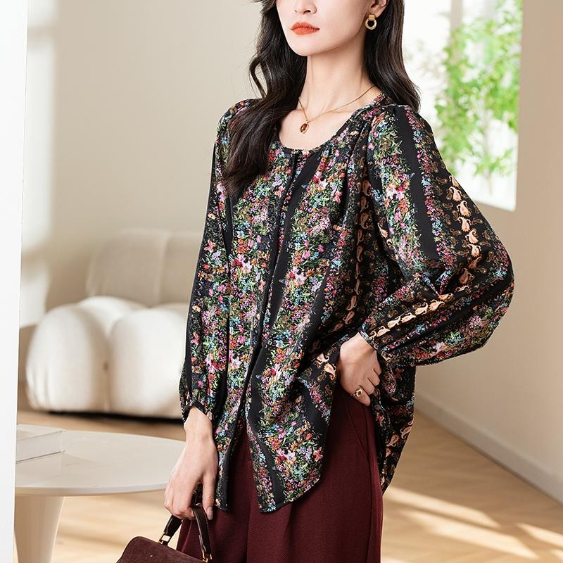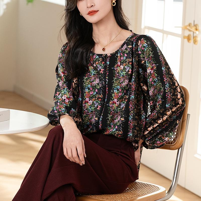เสื้อชีฟองพิมพ์ลายดอกไม้ผู้หญิงมุสลิม โมเด็ม ทรงหลวมยาวเสื้อคอกลมแขนโคมไฟ