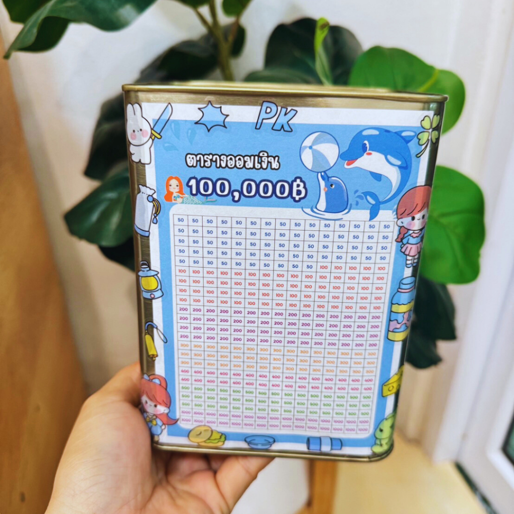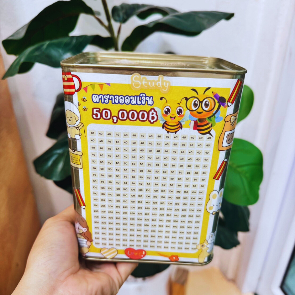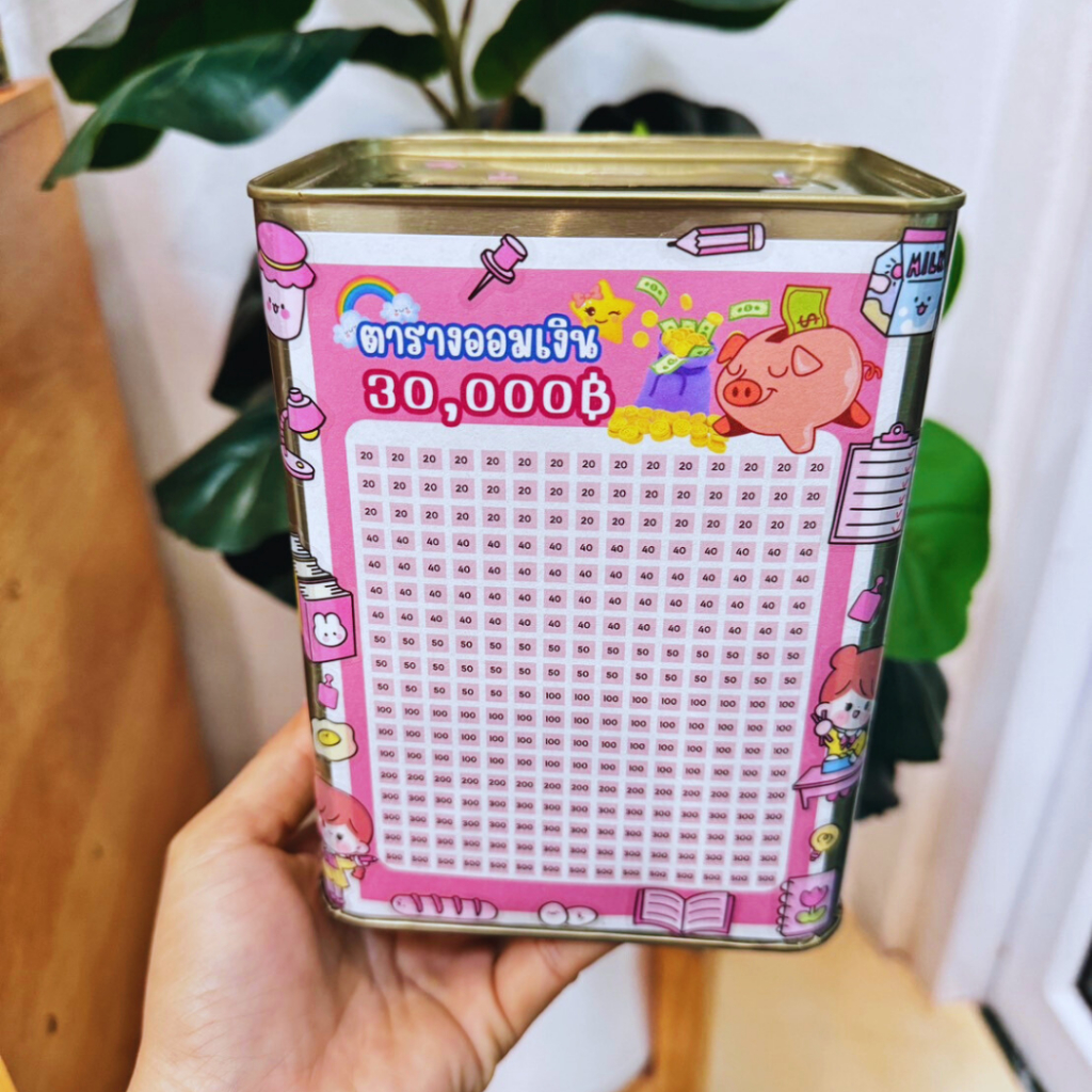 กระปุกออมสินปี๊บ ทึบจิ๋วสูง 15cm พร้อมตารางออมและสติ๊กเกอร์น่ารัก