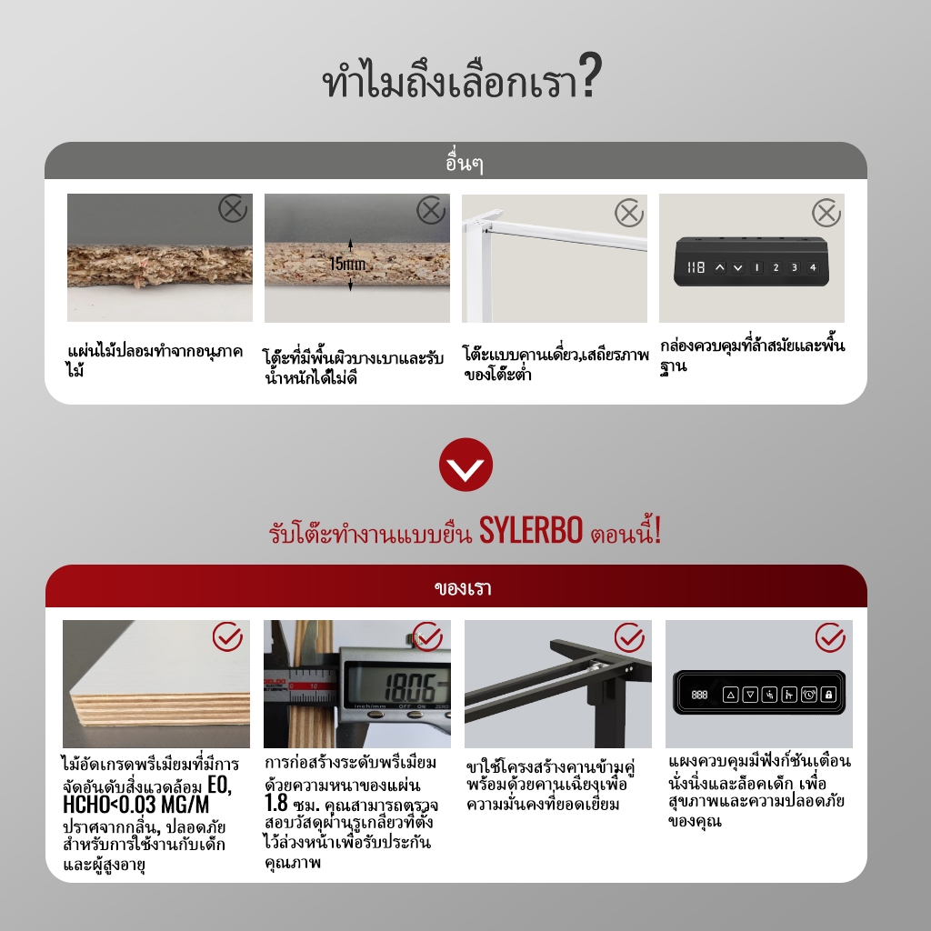 SYLERBOโต๊ะยกไฟฟ้าสำหรับการกำหนดค่าระบบมอเตอร์เดี่ยว โต๊ะยกไฟฟ้าแบบปรับความสูงได้ แผ่นไม้กว้าง 18 มม. การออกแบบคานคู่ ออกแบบตามหลักสรีรศาสตร์ เหมาะสำหรับการเล่นเกมและที่บ้าน