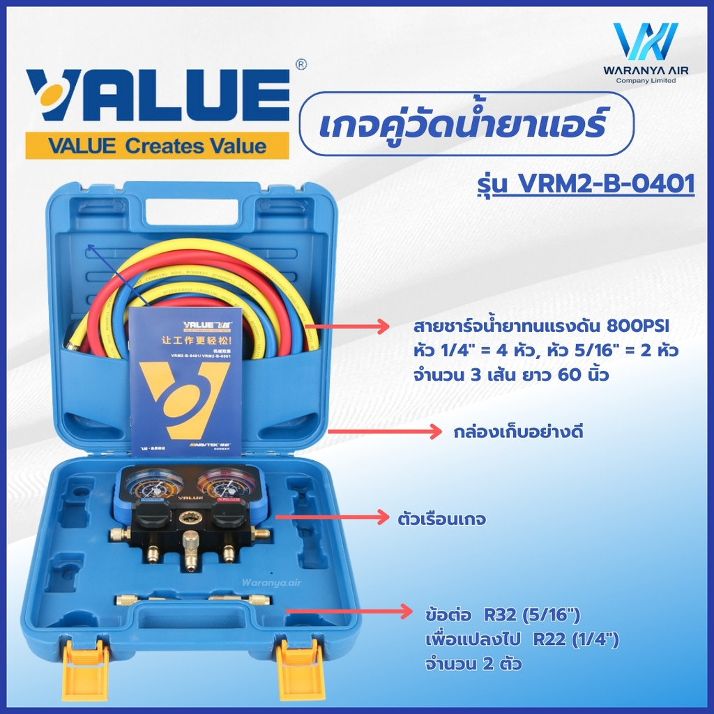 เกจคู่วัดน้ำยาแอร์ เกจชาร์จน้ำยา พร้อมสาย 60 นิ้ว (800psi) 3 เส้น วัดได้ทุกน้ำยา ยี่ห้อ VALUE รุ่น VRM2-B-0401