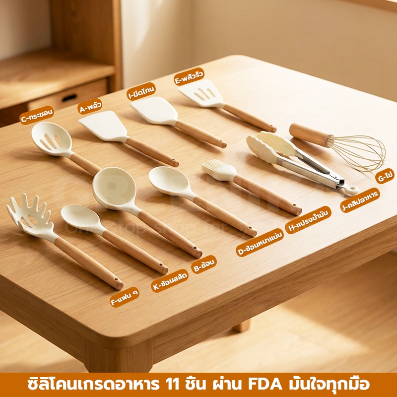 GREENIKA 11ชิ้นชุดซิลิโคนเกรดอาหาร ใช้ได้กับแม่และเด็ก ทนความร้อน ตะหลิว ทัพพี ไม้พาย กระบวย แปรง ที่คีบอาหาร