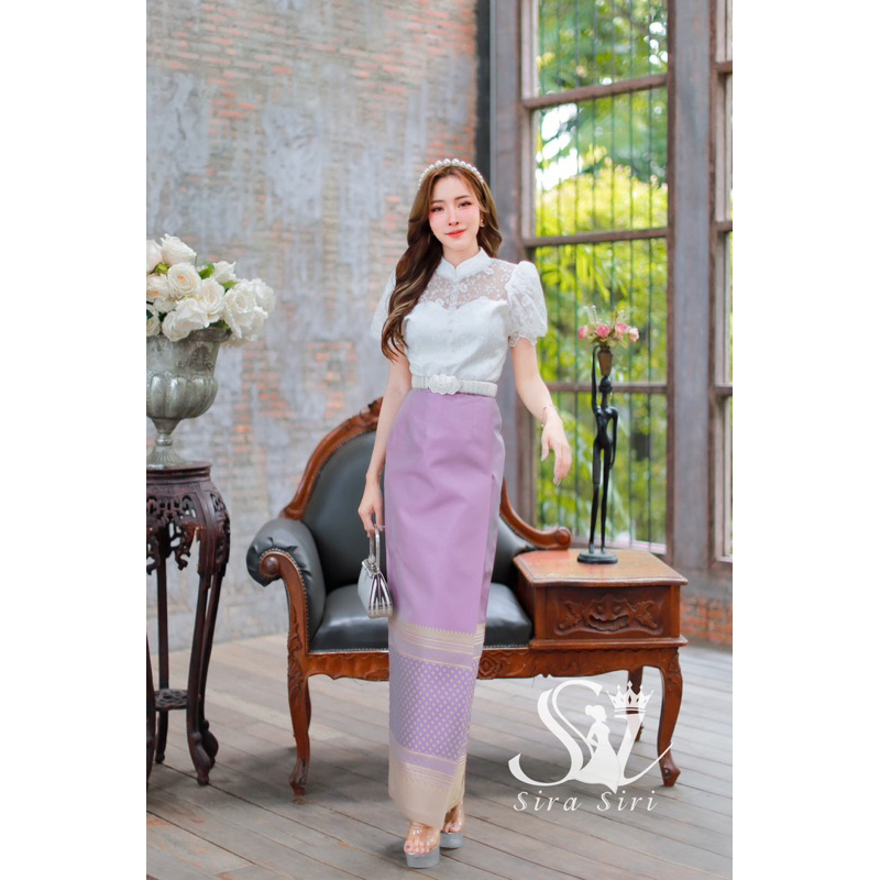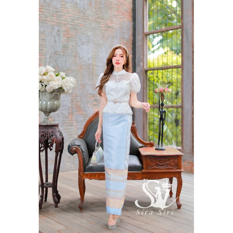 ชุดไทย Sira Siri เสื้อลูกไม้แขนตุ๊กตา ปักดอกลอยยกนูน ทรงคอตั้งคอจีน แต่งกระดุมมกุเรียง มีซับในช่วงตัว สวยมากๆจ้า