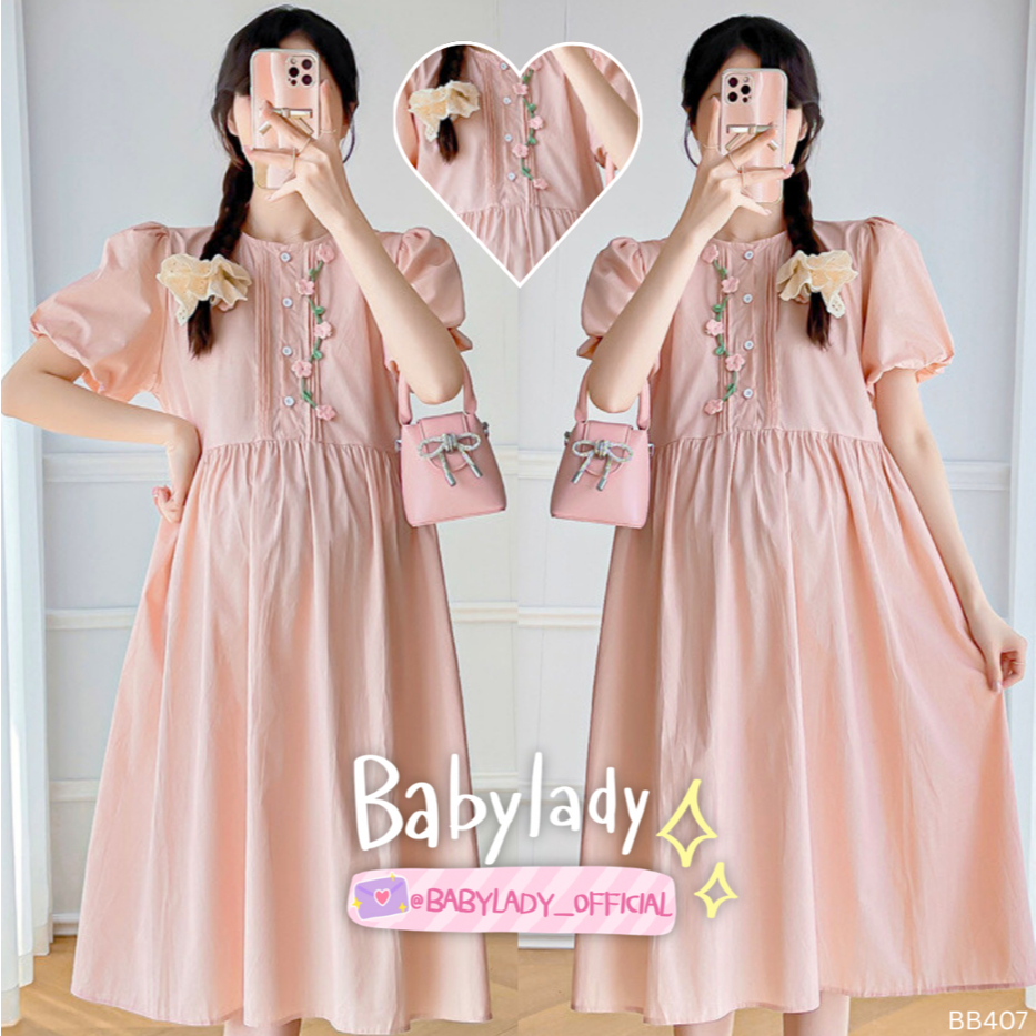 [BB 407] ชุดคลุมท้องให้นมได้ | BABYLADY ♡ - เดรสคอตตอน กระดุมให้นม ดอกไม้3D เอวปรับ