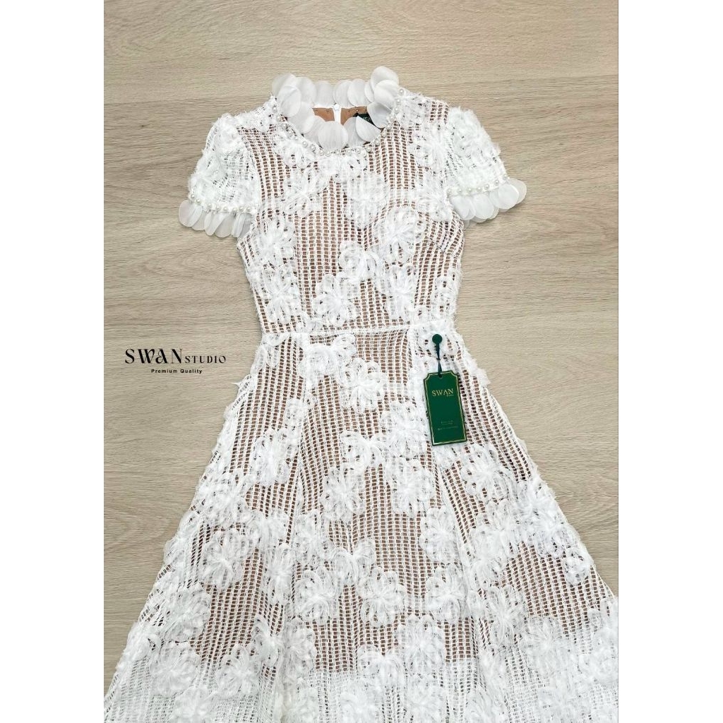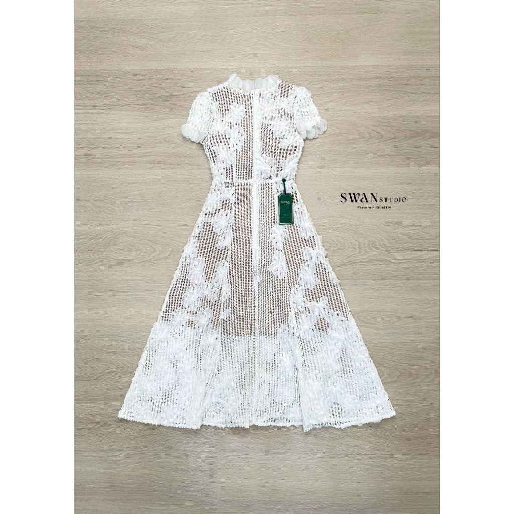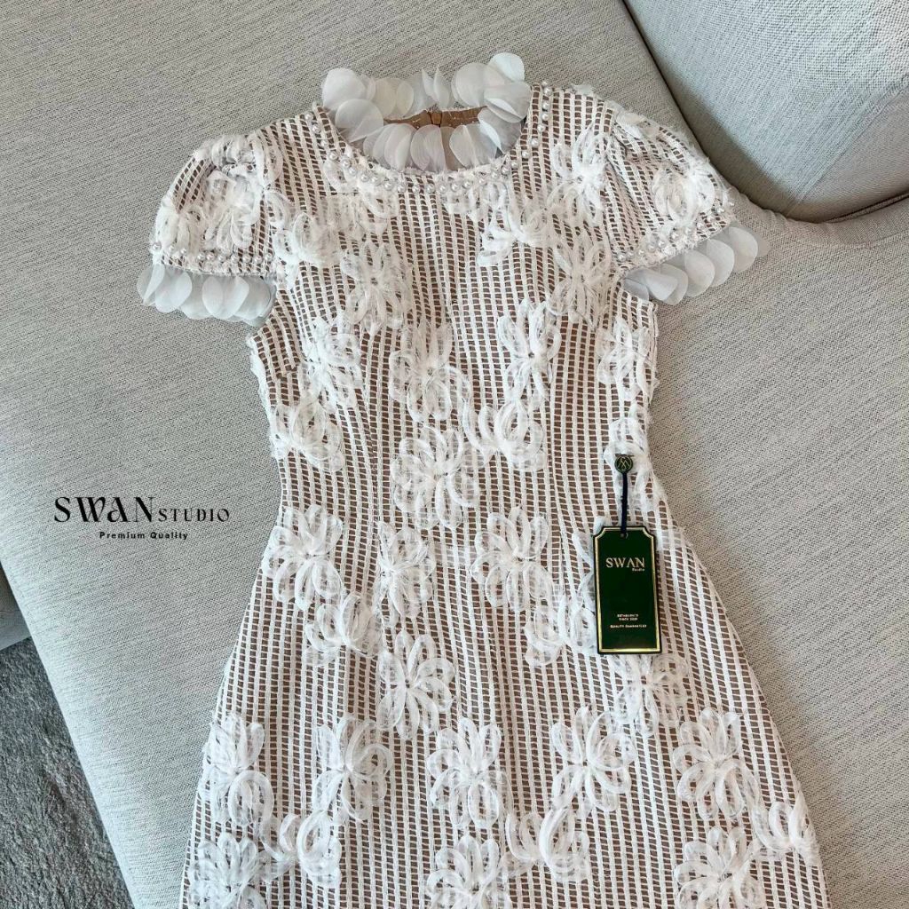 Swan เดรสผ้าลูกไม้ขาวปักลายดอกไม้ทั้งตัว คัตติ้งเข้ารูปช่วงเอวเน้นสัดส่วนสวยเป๊ะ