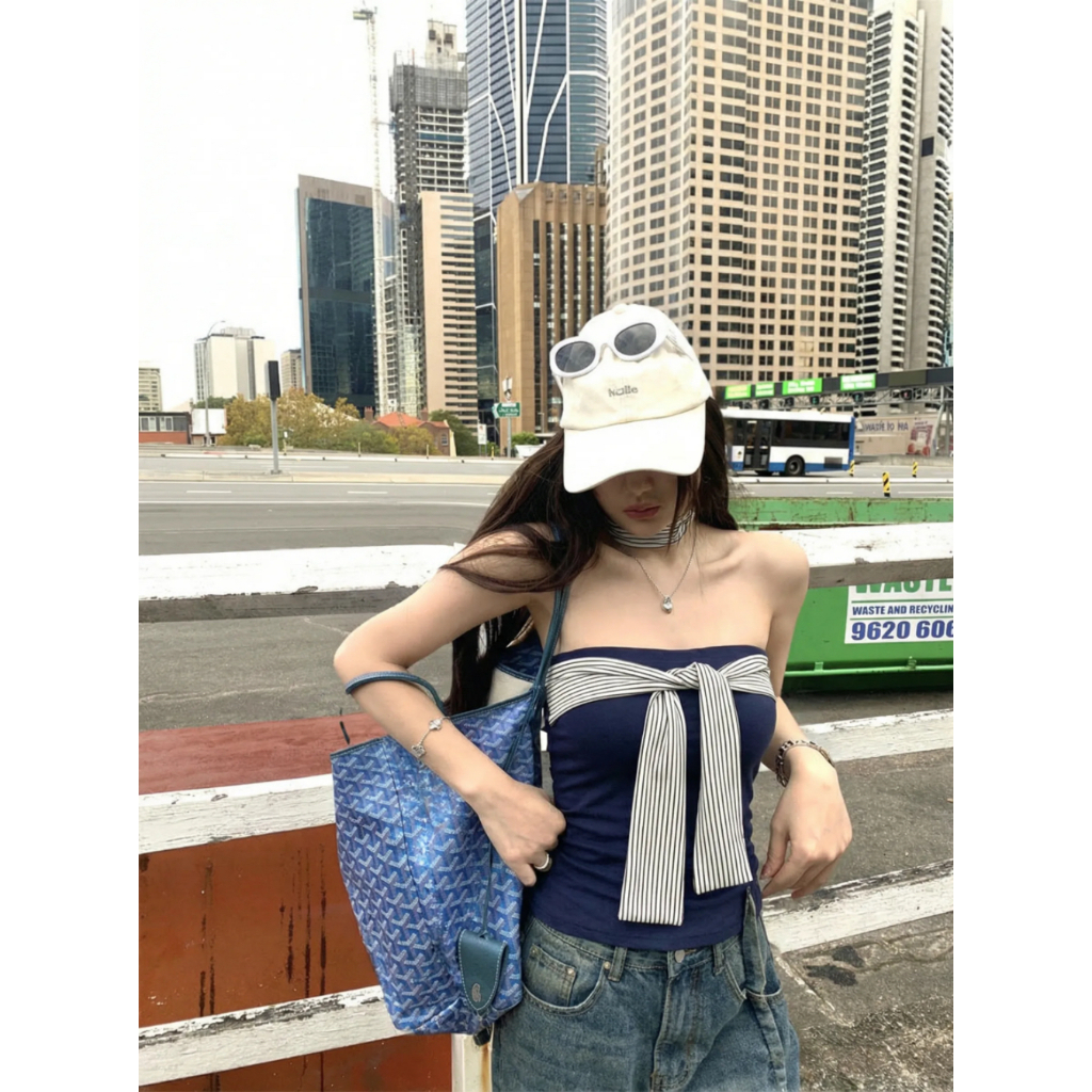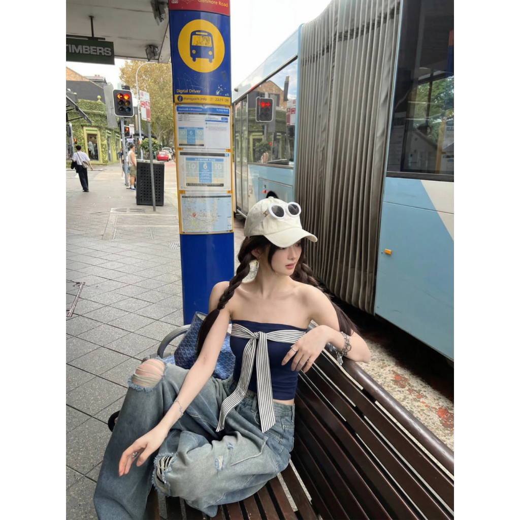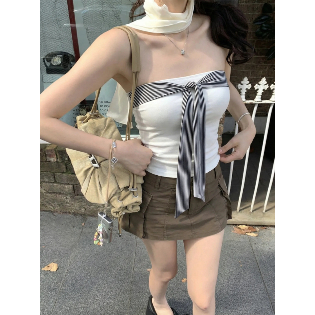 เสื้อเกาะอก ผูกโบว์หน้าอก สีพื้น ครอปฟิต เซ็กซี่กำลังดี สไตล์ Y2K | Black Cherry