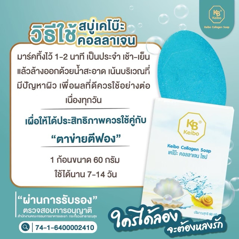 สบู่เคโบ๊ะคอลลาเจน Keibo ขนาด 60 กรัม ฝ้า กระ จุดด่างดำ หน้าหมองคล้ำ ( 6 ก้อน ) ฟรีถุงตีฟอง