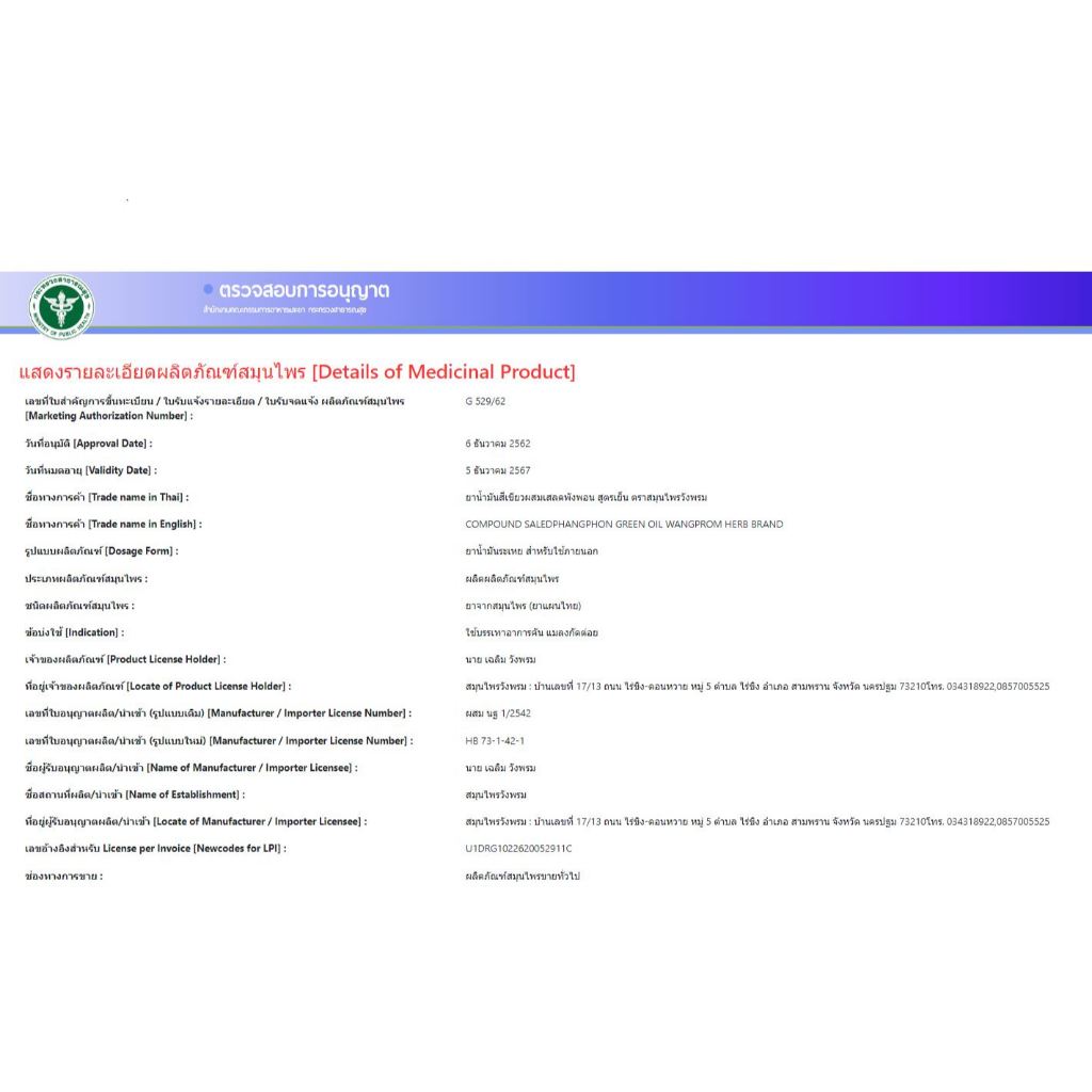 น้ำมันเขียวเสลดพังพอน สูตรเย็น สมุนไพรวังพรม 5 ซีซี - (1ขวด)