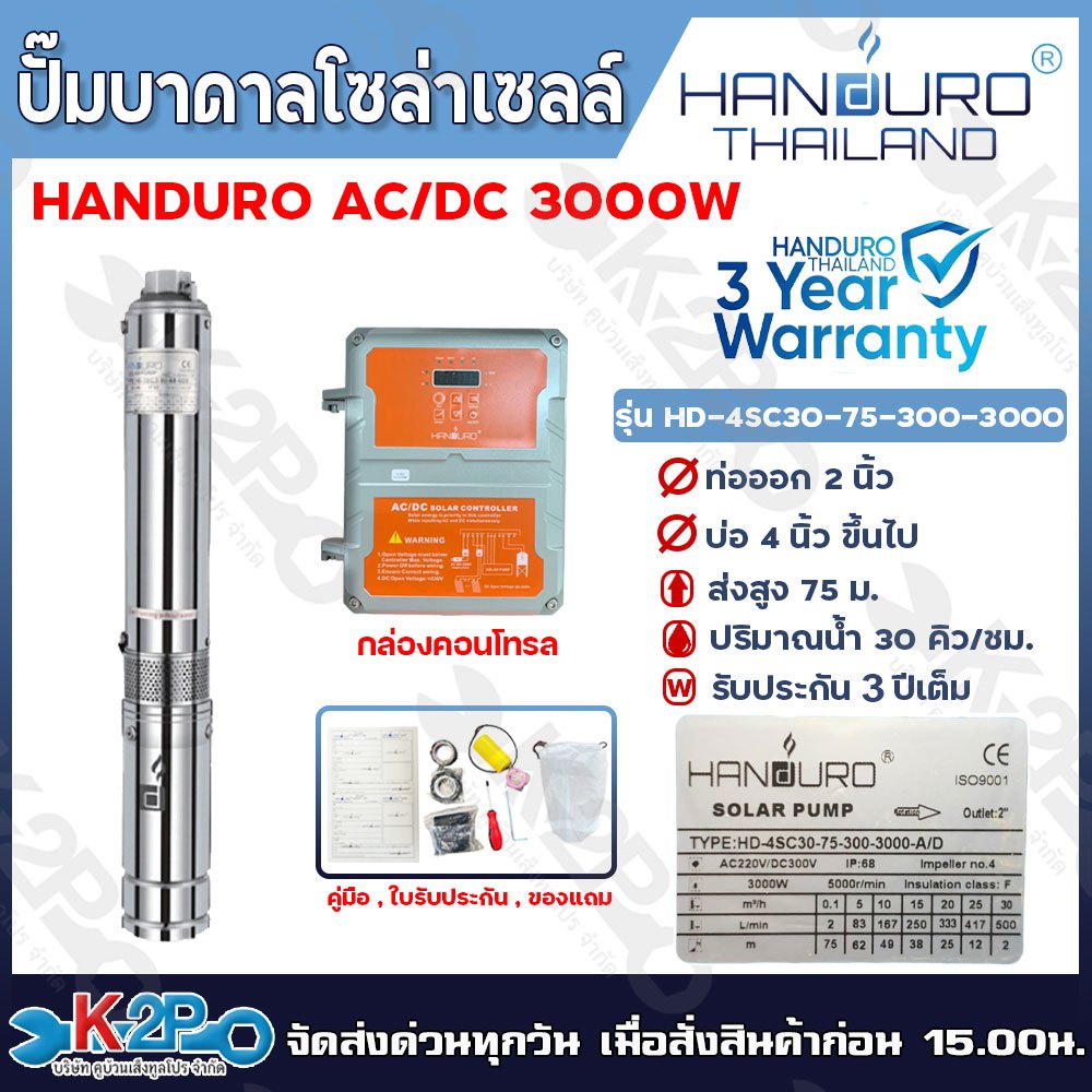 HANDURO ปั๊มบาดาลโซล่าเซลล์ ปั๊มน้ำบาดาลไฟโซล่าเซลล์ AC/DC 3000W ลงบ่อ 4 นิ้ว/ 6นิ้ว ขึ้นไป ท่อออก 2นิ้ว / 3นิ้ว รับประก