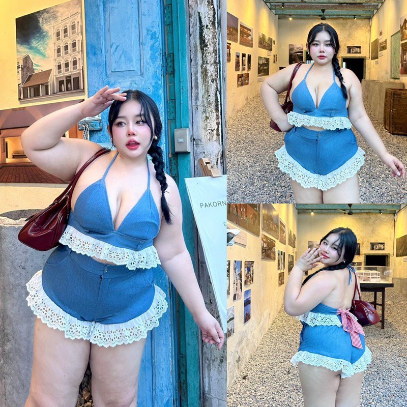 ✅/TB/ ชุดเซ็ตสาวอวบ เสื้อครอปผูกหลัง +กางเกงขาเว้า แต่งระบายลูกไม้ฉลุ ซัมเมอร์มาก #สาวอวบอ้วน