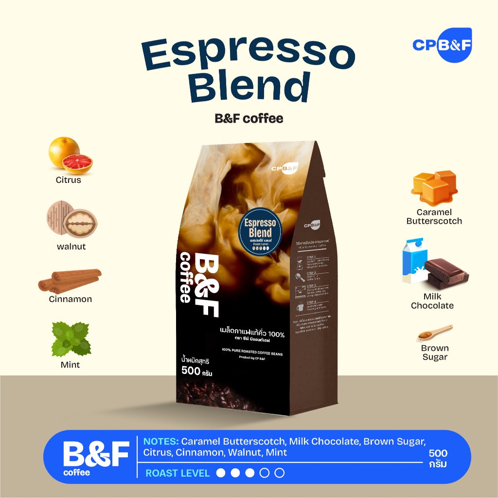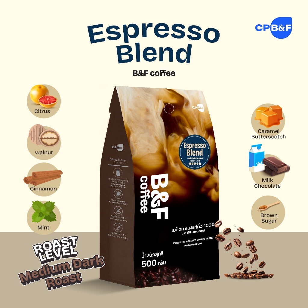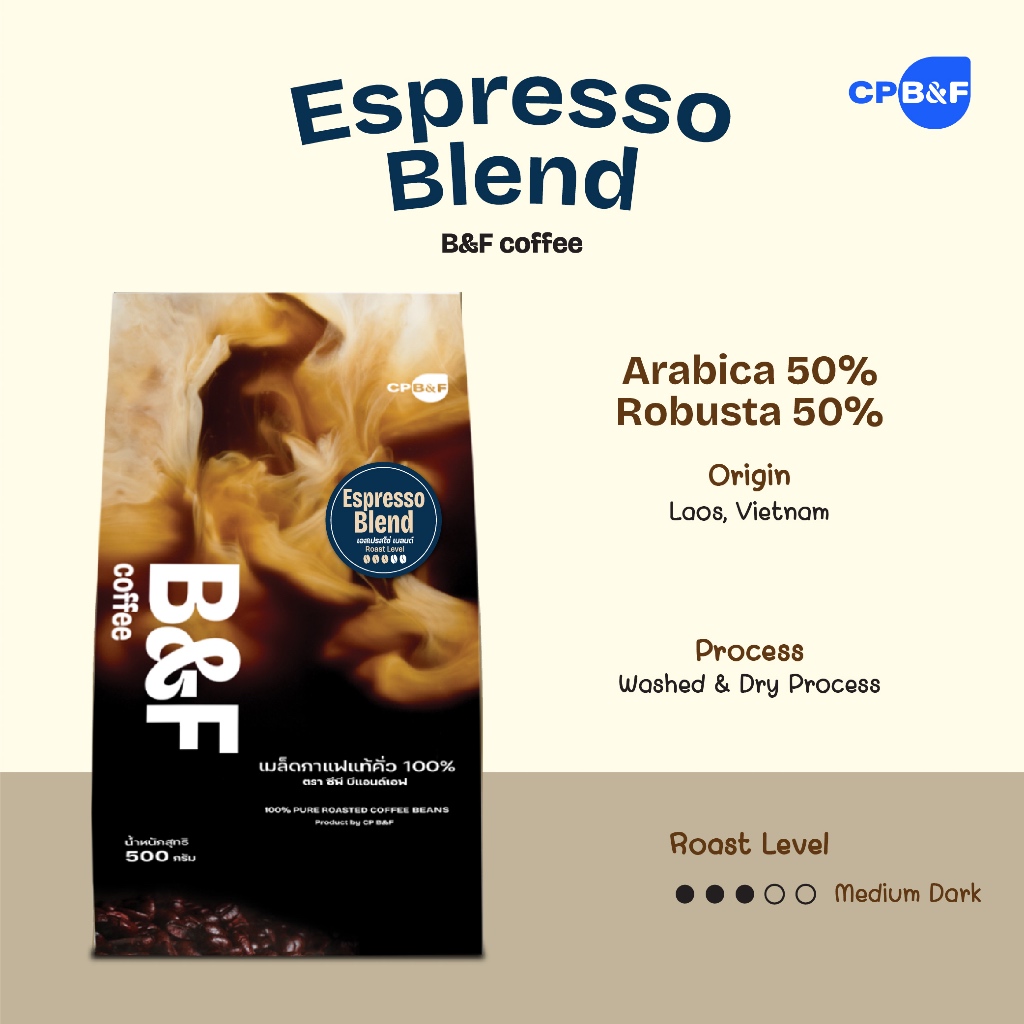 เอสเปรสโซ่ เบลนด์ เมล็ดกาแฟแท้คั่ว 100% (คั่วกลางค่อนเข้ม) ผสมอาราบิก้าและโรบัสต้า หอม นุ่ม กลมกล่อม