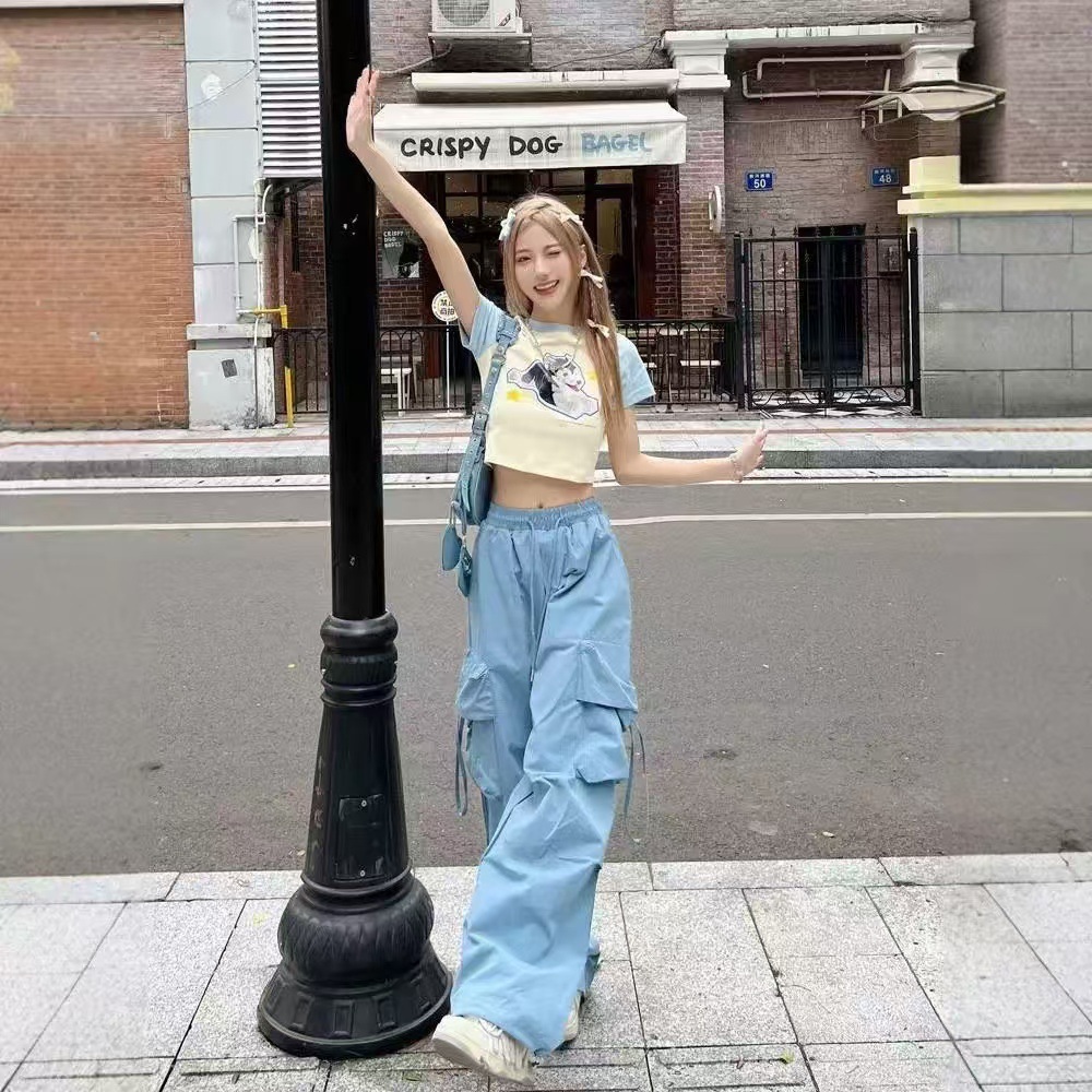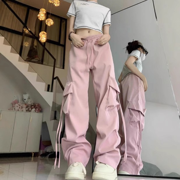 😎ชุดเอี๊ยมผู้หญิง กางเกงขากว้าง เอวสูง กางเกงกระเป๋าข้าง สไตล์อเมริกันเรโทร มี 5 สี