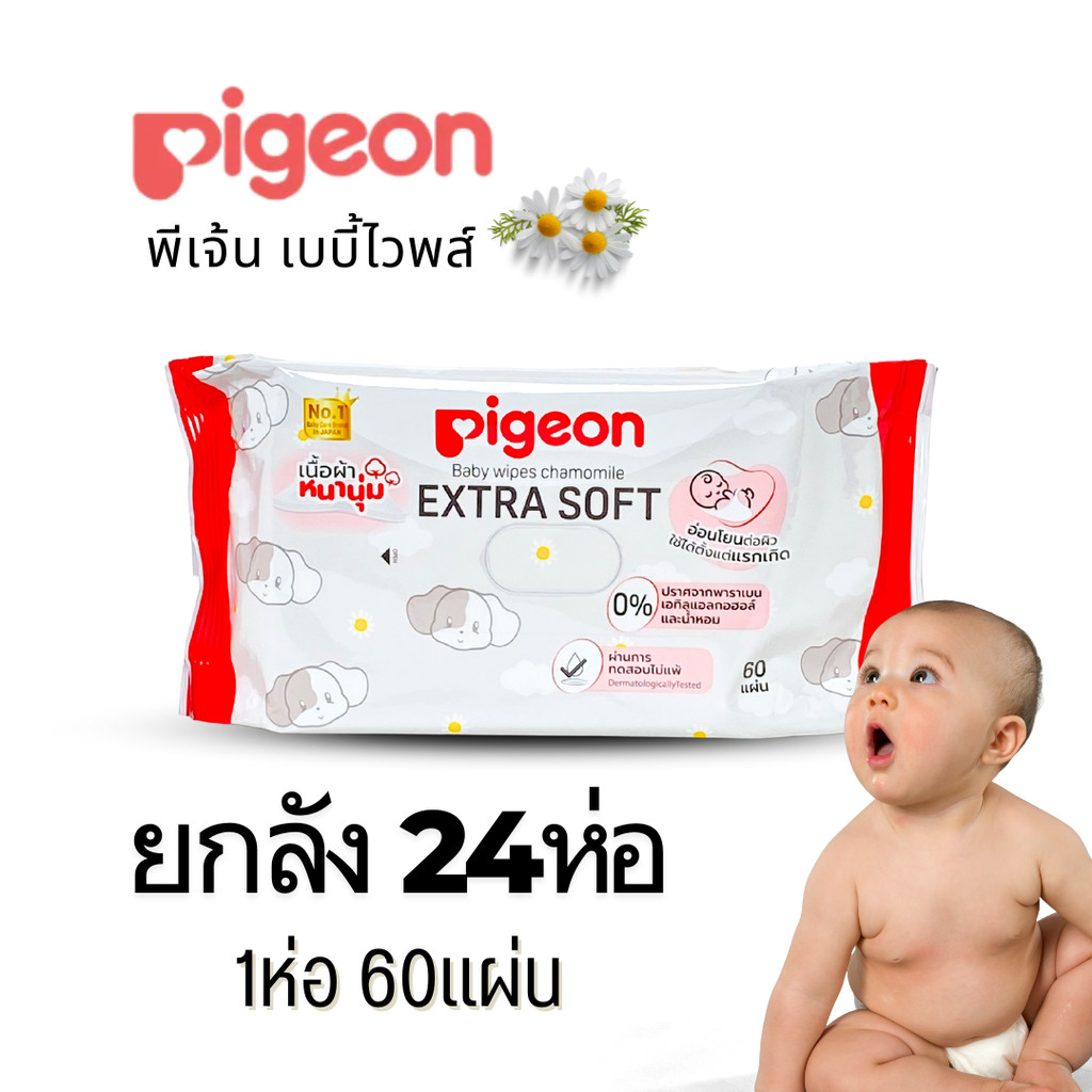 (ยกลัง24ห่อ) pigeon ทิชชู่เปียก Baby Wipes ยกลัง 24ห่อ ผ้าหนานุ่ม ห่อ60แผ่น กระดาษเปียกพีเจ้น สูตรคาโมมายล์