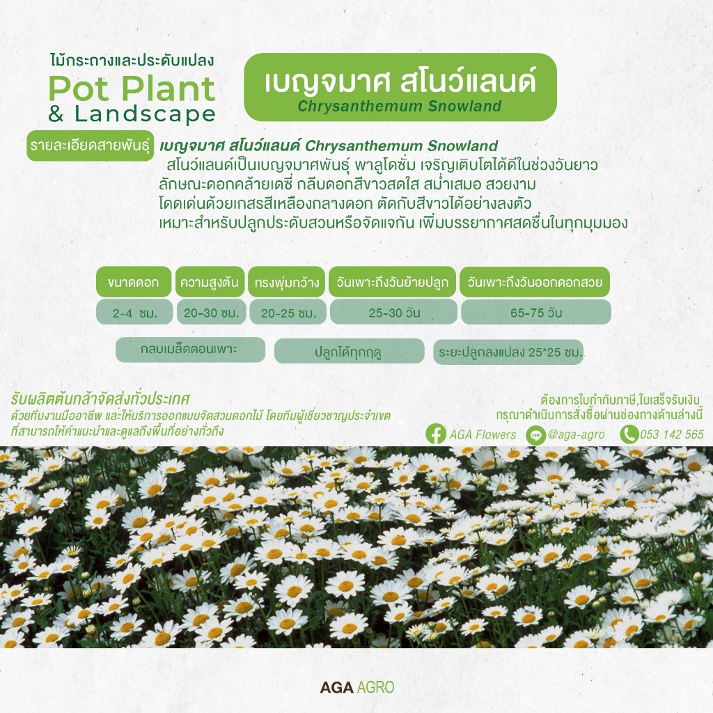 AGA AGRO I "เบญจมาศ สโนว์แลนด์"ดอกคล้ายเดซี่ กลีบดอกสม่ำเสมอ-100เมล็ด-Chrysanthemum Snowland