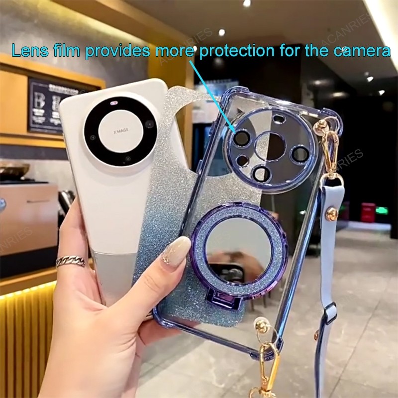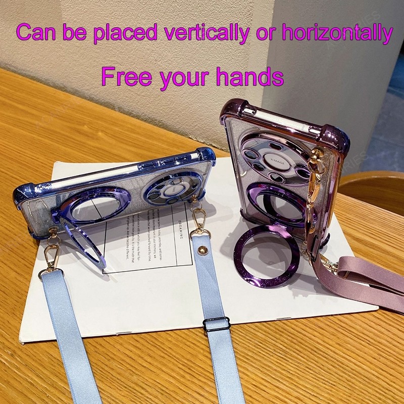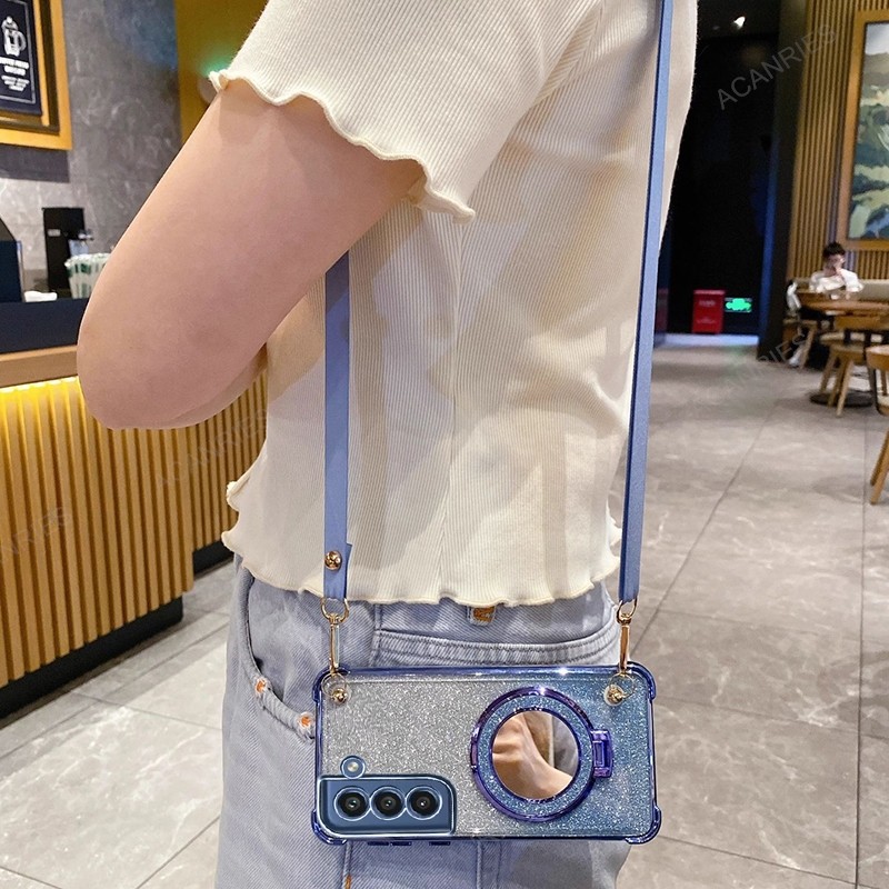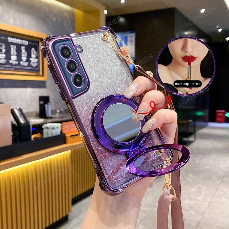 Samsung Galaxy S25 S24 Ultra S21 S24 S23 FE Plus Crossbody Lanyard สี่มุม Anti-Shock Plating Case กระจกแต่งหน้าขาตั้งฝาครอบ