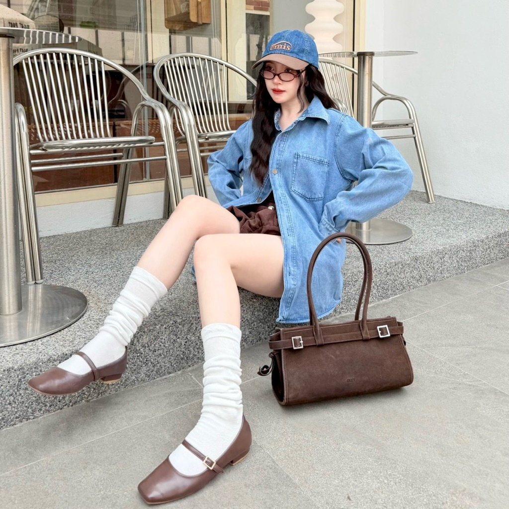 🌻เสื้อเชิ้ตยีนส์ทรงโอเวอร์ไซส์แขนยาวแต่งกระเป๋าหน้าสองข้าง ดีเทลกระดุมหน้าใช้งานได้จริง (Cookies bear)