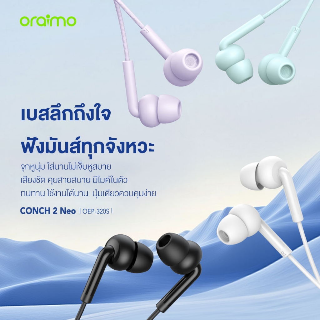 oraimo CONCH 2 Neo OEP-320S หูฟังแบบมีสาย เบสแน่นทรงพลัง ไมโครโฟนในตัว ความทนทานที่ดีขึ้น รีโมตควบคุมด้วยปุ่มเดียว จุกหูฟังใส่สบาย มีหลายสีให้เลือก