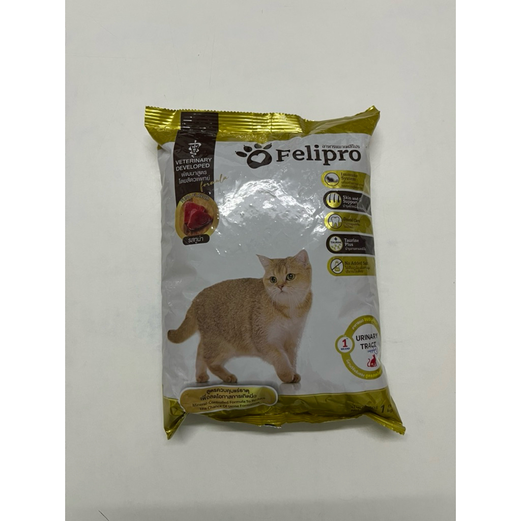 Felipro Cat Food tuna เฟลิโปร สีทอง อาหารแมวรสทูน่า ลดโอกาสเกิดนิ่วเหมาะสำหรับแมวหลังหย่านม 1kg 15/04/2027 แถมซองเล็ก