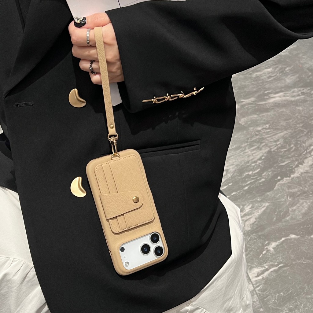 หรูหราสีกากีสีดําช่องใส่การ์ดกระเป๋าหนัง PU Wrsit สายคล้องเคสโทรศัพท์สําหรับ iPhone 17Promax 17Pro 16Promax 13 14 15 Pro Max กันกระแทกป้องกันผู้หญิงฝาครอบมือถือ
