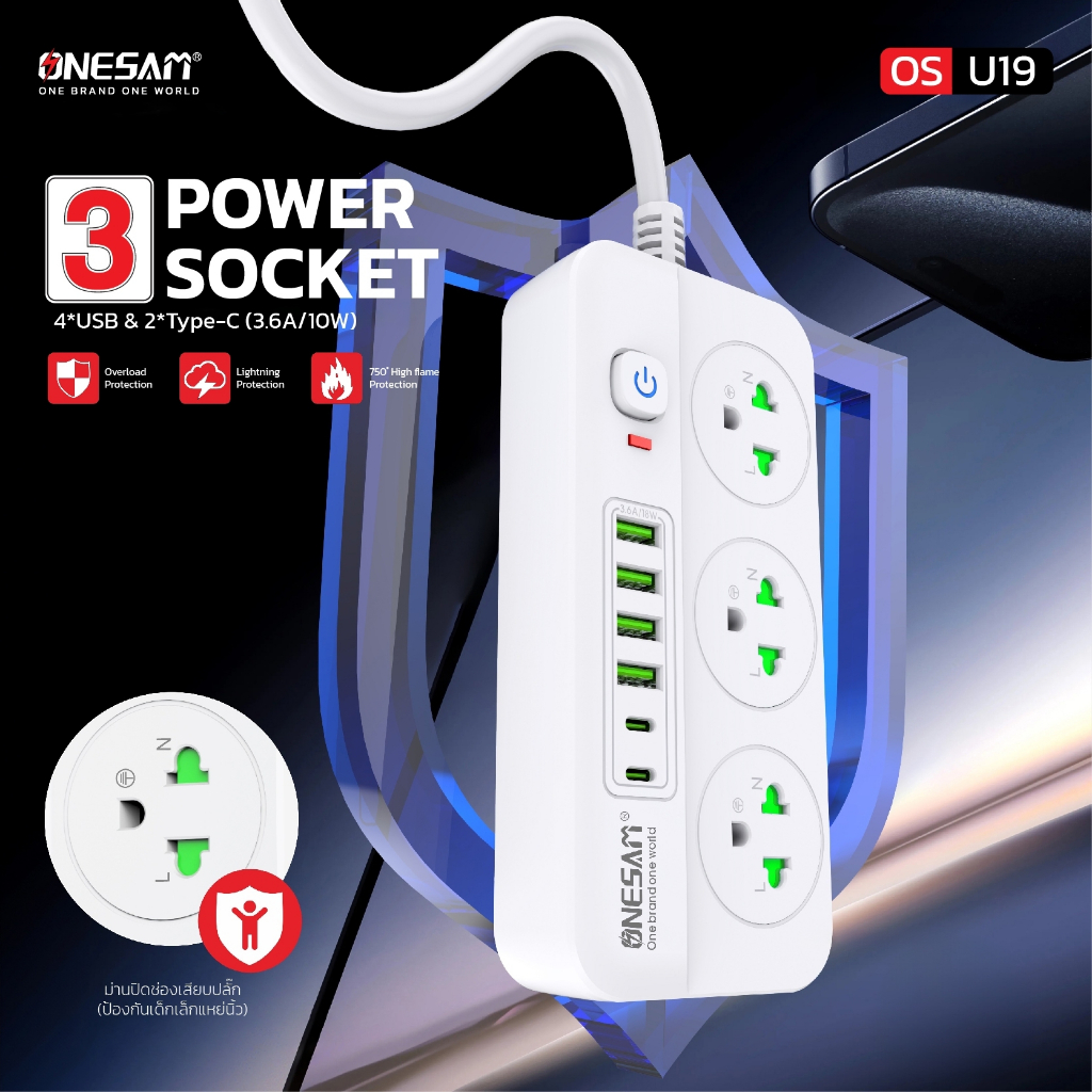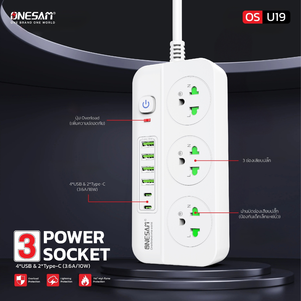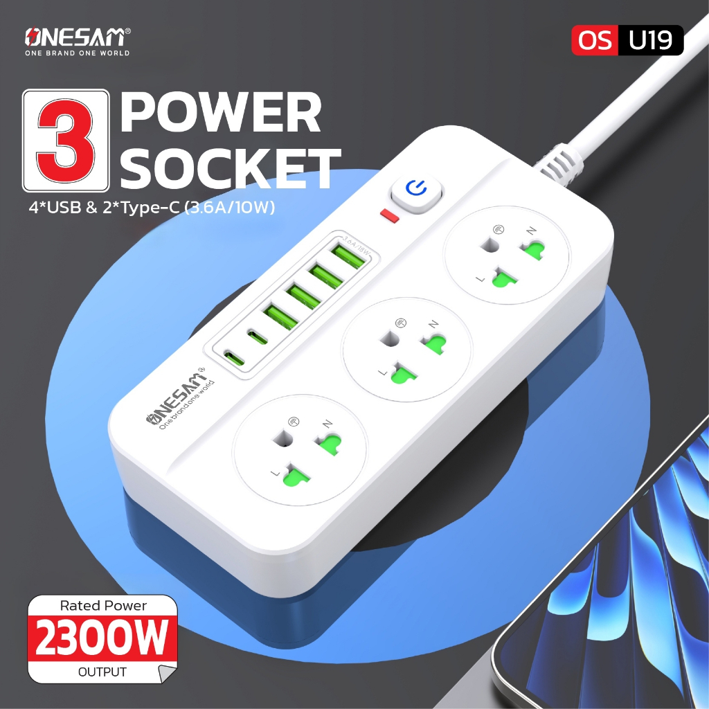 ปลั๊กไฟ ONESAM รุ่น OS-U19 4 USB พอร์ต และ 2 PD พอร์ต ชาร์จไว 3.6A/18W สายยาว 2,5 เมตร