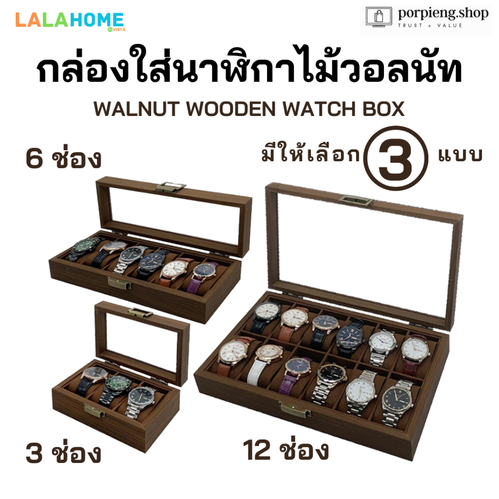 Lala Home กล่องใส่นาฬิกา 3/6/12 ช่อง ไม้วอลนัทแท้ ฝากระจก เกรดพรีเมี่ยม ทนทาน หรูหรา Premium Walnut Wooden Watch Box