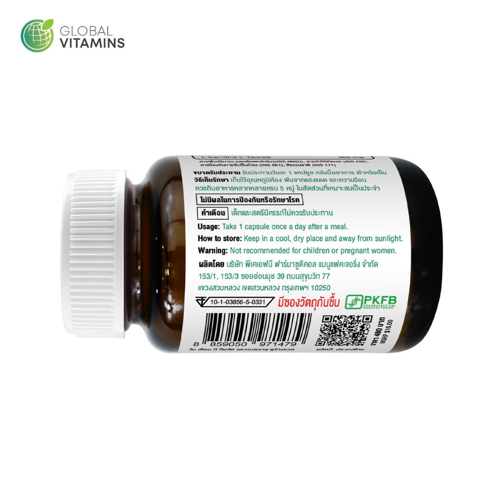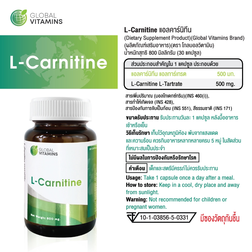 [แพ็ค 3 ขวด] แอลคาร์นิทีน โกลบอลวิตามิน L-Carnitine Global Vitamins LCarnitine L Carnitine แอลคาร์นิทีน แอลทาร์เทรต