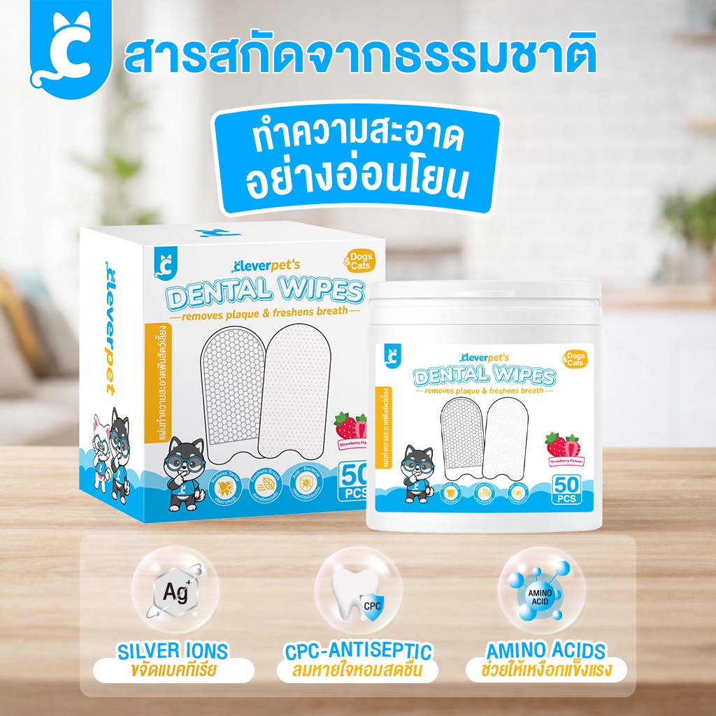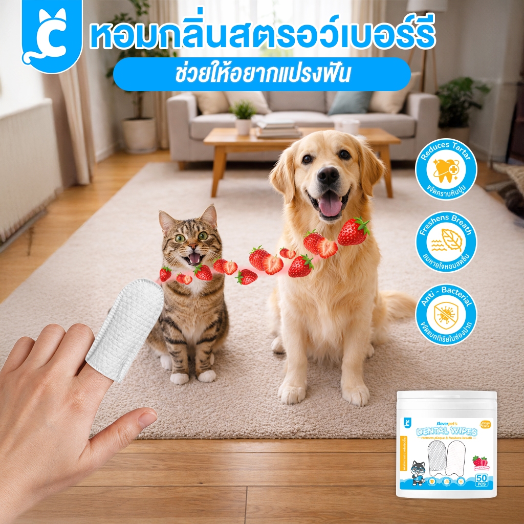 [ส่งฟรี🇹🇭] Cleverpet แผ่นทำความสะอาดฟัน 50 แผ่น แผ่นขัดฟันสุนัขและแมว แผ่นเช็ดฟัน กลิ่นสตรอว์เบอร์รี Dental Wipes