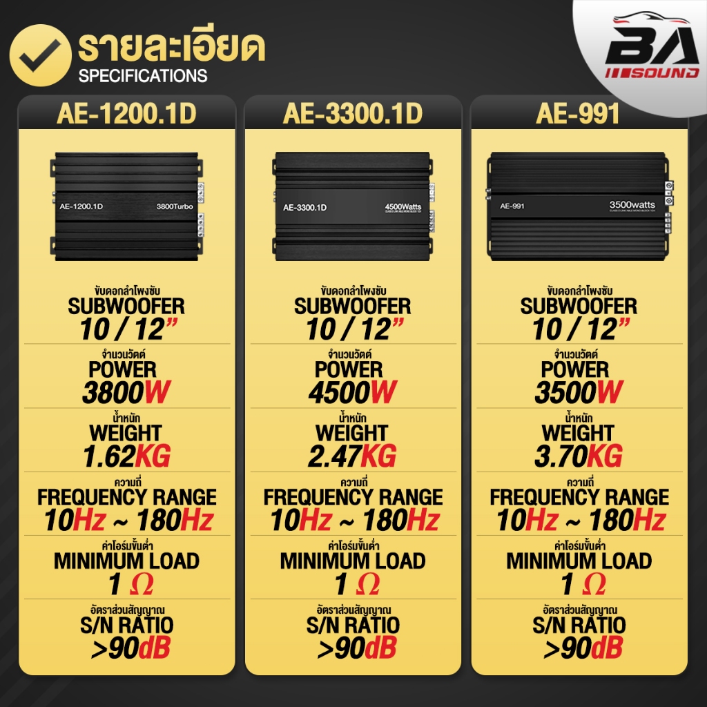 BA SOUND เพาเวอร์แอมป์ CLASS D 2CH. มี 3 รุ่นให้เลือก AE-1200.1D/AE-3300.1D/AE-991 ขับได้ลำโพงซับ 10 นิ้ว / 12 นิ้ว