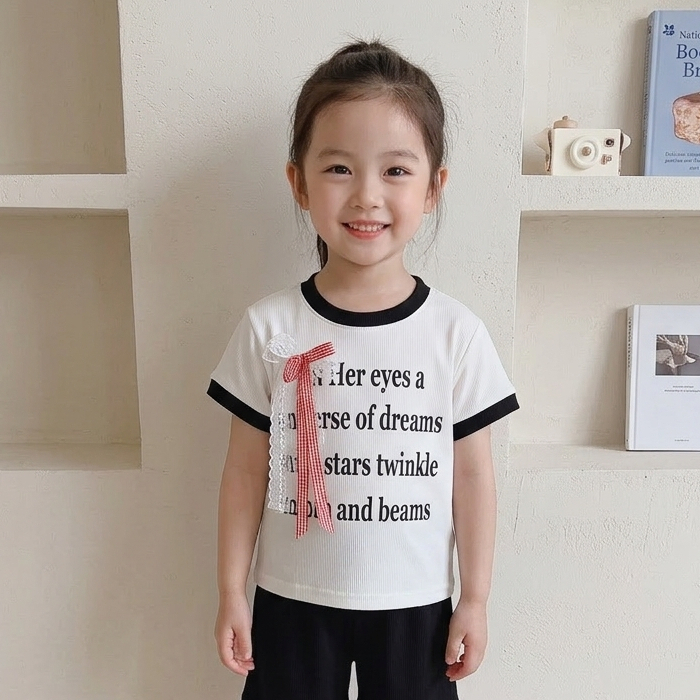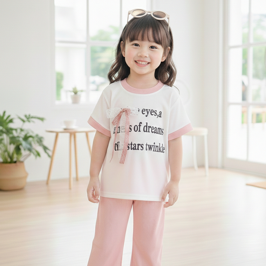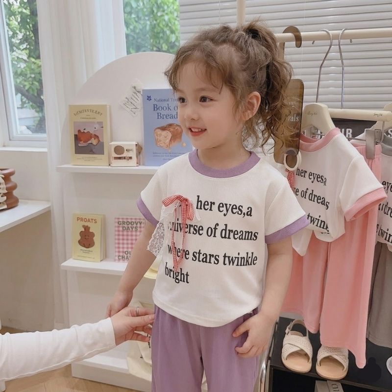 Babyonline(Y435)O2 (ส่งด่วน1วัน)ชุดเซ็ตเสื้อยืดคอกลมแขนสั้นและกางเกงขายาว แต่งโบว์สุดน่ารัก ผ้าร่อง นิ่ม
