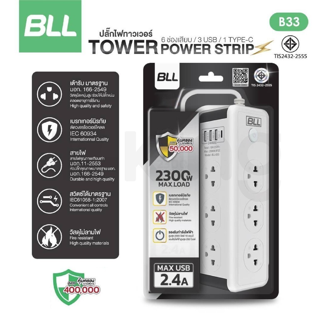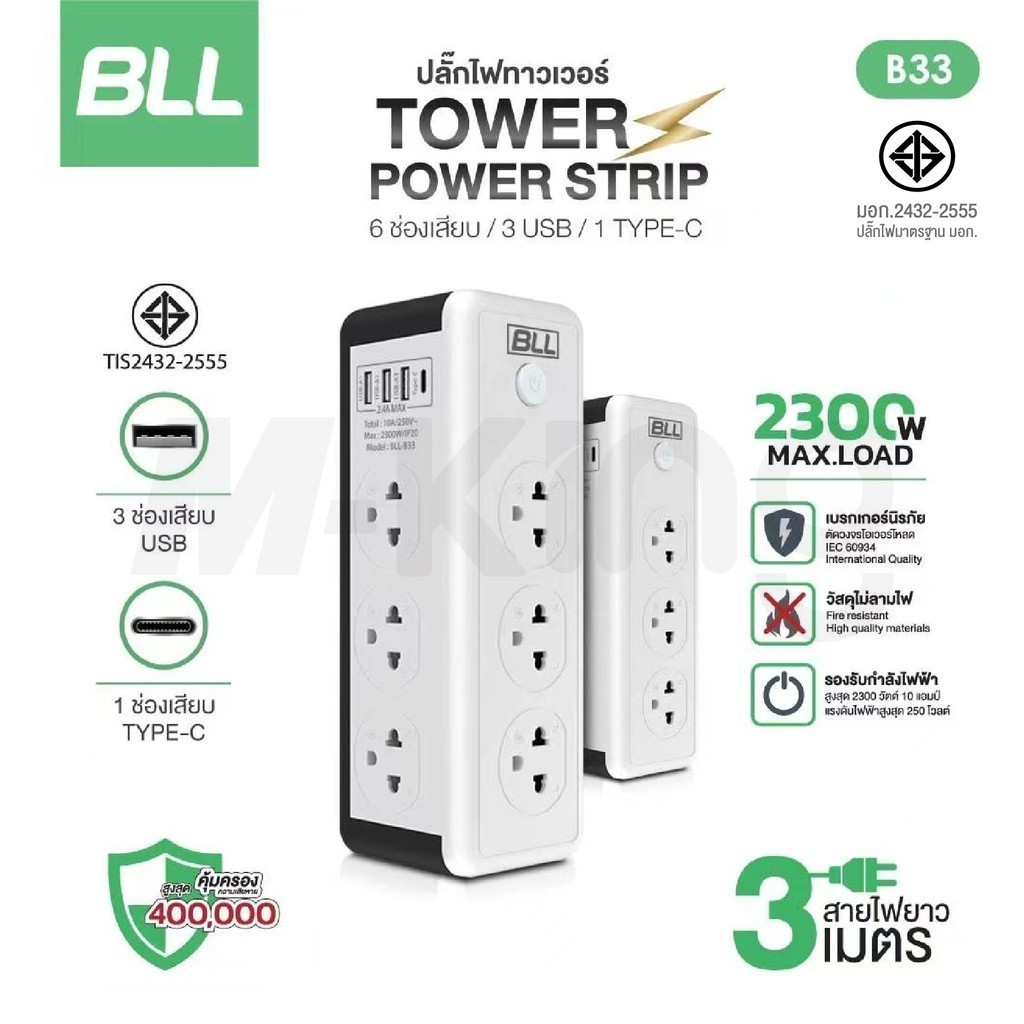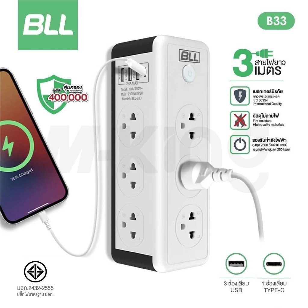 ปลั๊กไฟ BLL รุ่น B33 Plug ปลั๊กไฟคอนโด 2300W 6ช่องเสียบ 1สวิตซ์ 3ช่องUSB 1ช่องType-C ยาว 3เมตร
