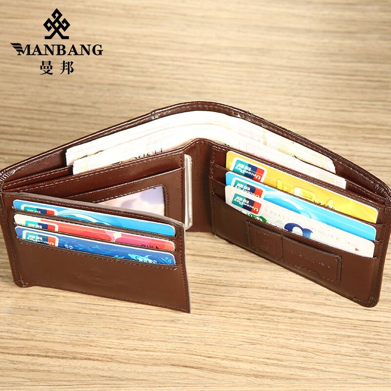 หนังวัวแท้/จัดส่งฟรี/กล่องของขวัญMANBANG แบรนด์ขายร้อนกระเป๋าสตางค์ผู้ชายหรูหราเดิมสั้น Tri-Fold First Layer Cowhide กระเป๋าธุรกิจแนวนอนแฟชั่น