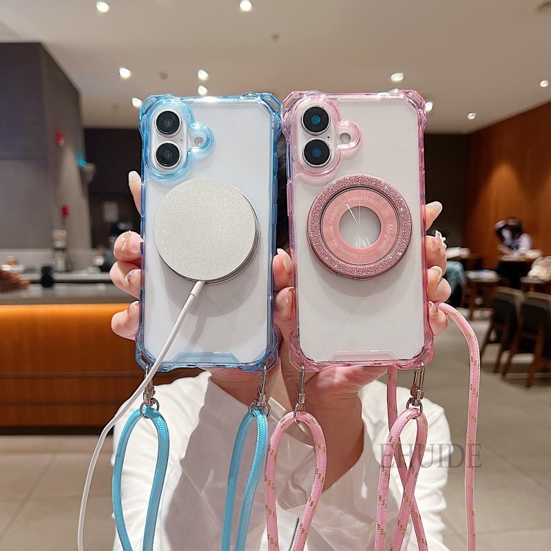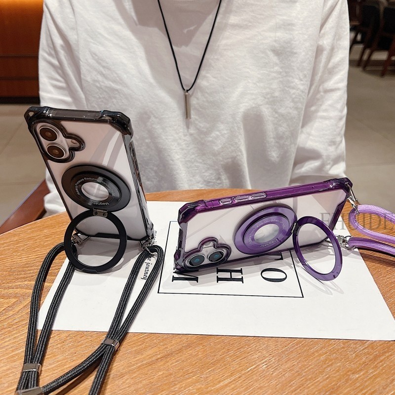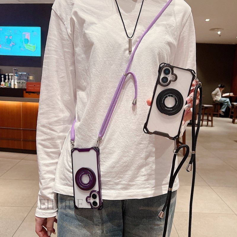 Iphone 16 15 14 13 11 12 Pro Max XS X Plus 360 Rotation Magnetic Metal Ring Stand Case Crossbody Lanyard Strap Clear Cover