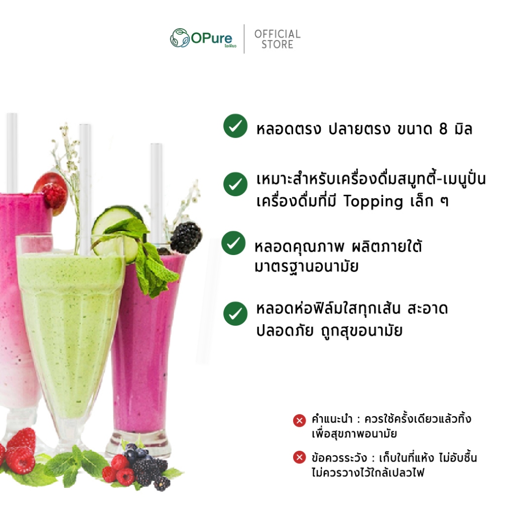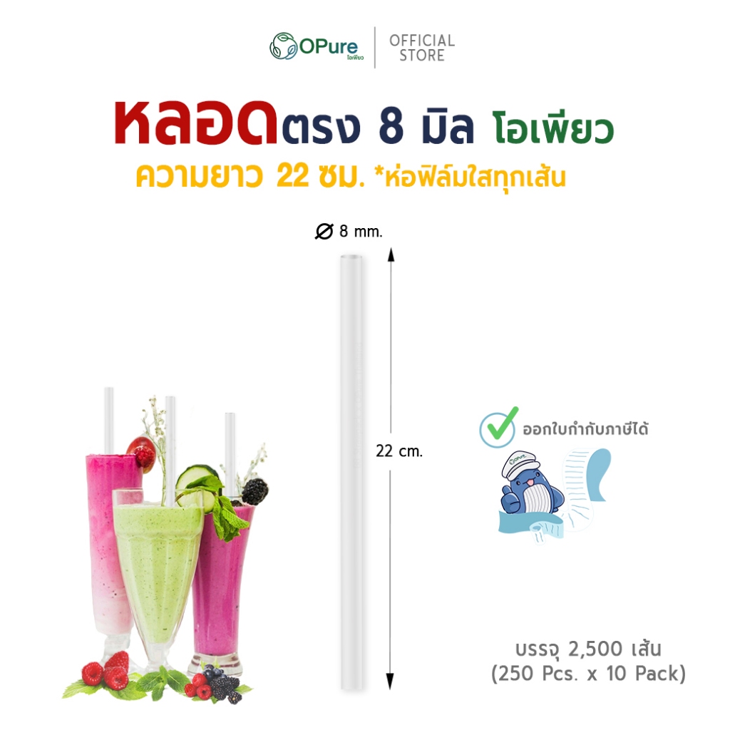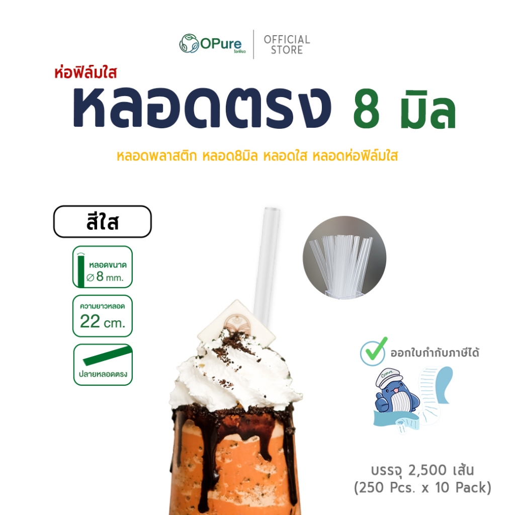 (2,500 เส้น) หลอดตรง 8 มิล ยาว 22 ซม. *สีใส - ห่อฟิล์มใสทุกเส้น หลอดพลาสติก OPure แนะนำใช้กับสมูทตี้