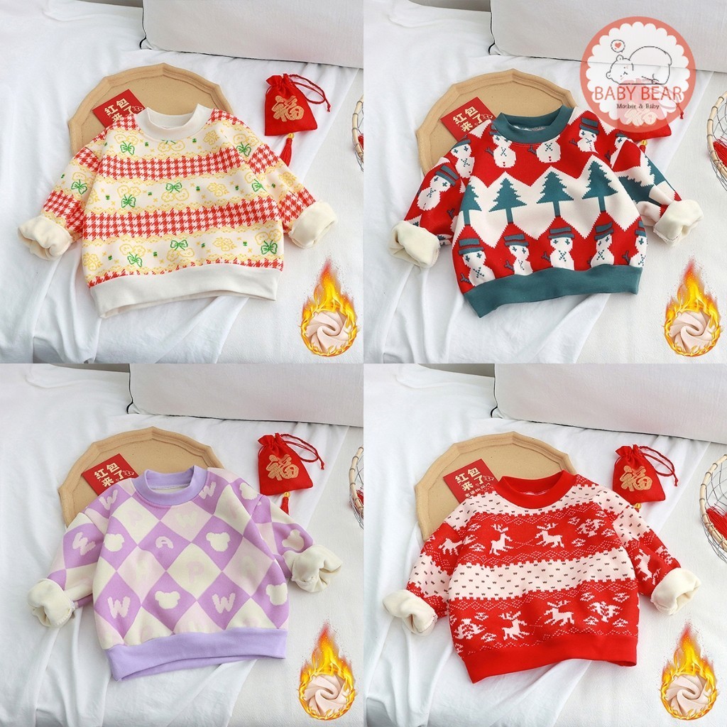 เสื้อกันหนาวเด็ก สเวตเตอร์กันหนาว เสื้อกันหนาวแฟชั่น ลายคริสมาสต์ ด้านในอุ่นๆ หนา นุ่ม