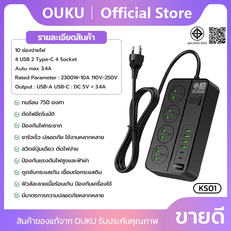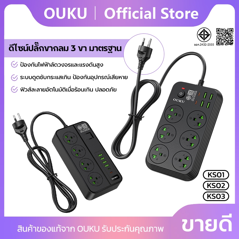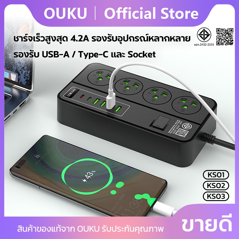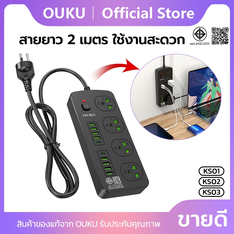 ปลั๊กพ่วงชาร์จเร็ว สายยาว 2 เมตร 2300W USB/Type-c/Socket มี 5 รุ่นให้เลือก OUKU KS01-KS05