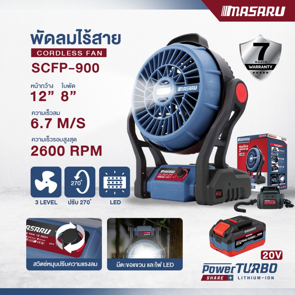 พัดลมไร้สาย 10/12 นิ้ว MASARU SCFP-900 SCFP-910 มีไฟในตัว พัดลมตั้งแคมป์ พัดลมพกพา พัดลมไฟฟ้า