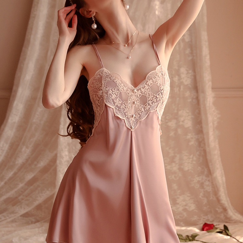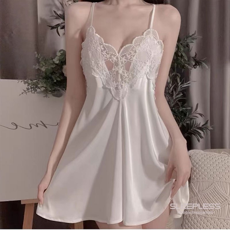 sleepless pajamas ชุดนอนเซ็กซี่ ชุดนอนผ้าซาติน ชุดลูกไม้เซ็กซี่ ดีพ วี สายสะพายไหล่ปรับได้ (H9070)
