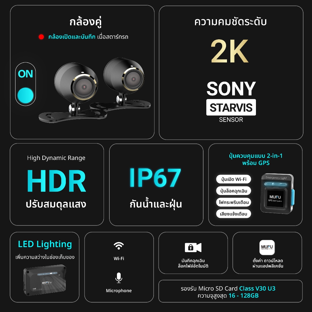 MUFU M4 กล้องติดรถมอเตอร์ไซค์ รถจักรยานยนต์ 2K HDR, Wi-Fi GPS กันน้ำ IP67 รับประกัน 1 ปี