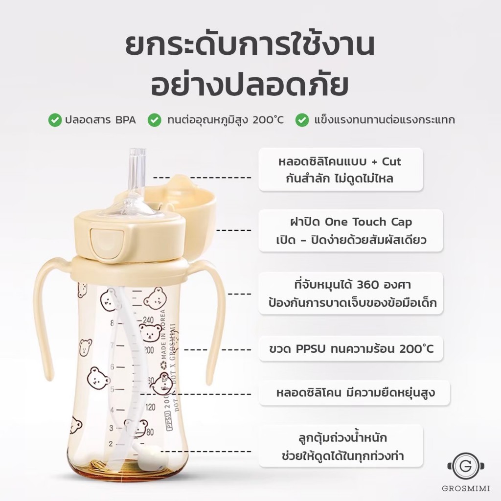ขวดหัดดูด Grosmimi PPSU Olive Straw Cup 300มล. ฝาปิดแบบ One Touch Cap และที่จับหมุนได้ 360 องศา
